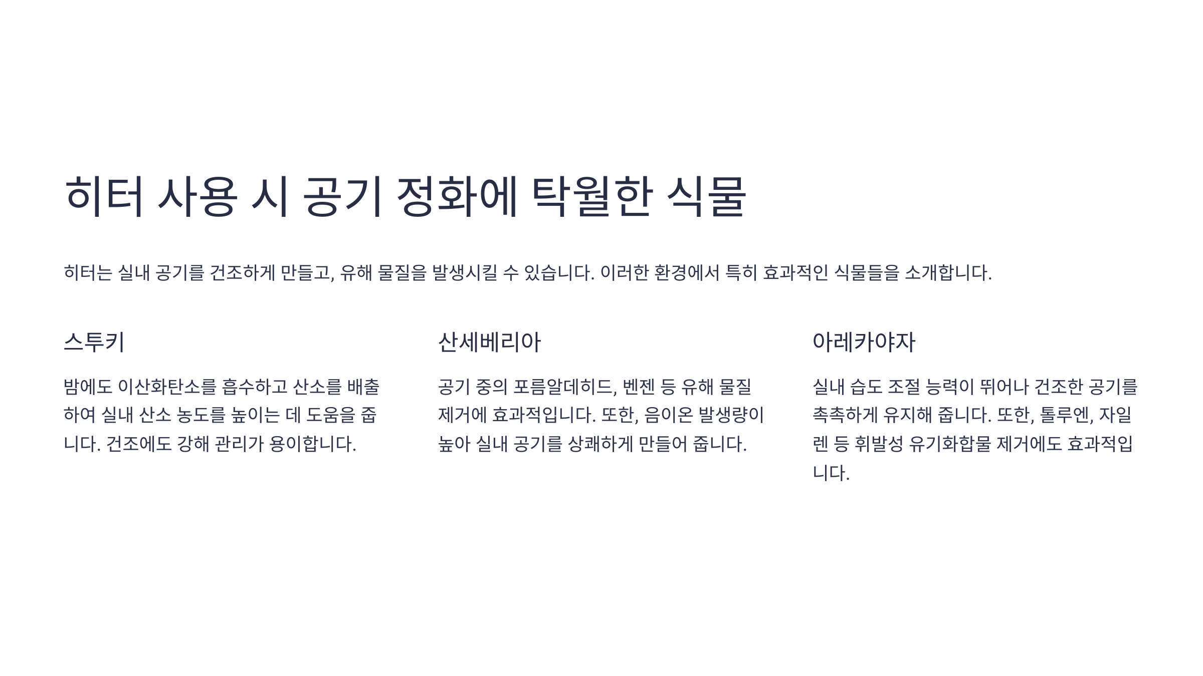 3️⃣ **스파티필럼** – 실내 오염 물질을 제거하고 습도를 조절하는 능력이 뛰어나요. 히터 바람이 직접 닿지 않는 곳에 두면 더욱 건강하게 자라요.