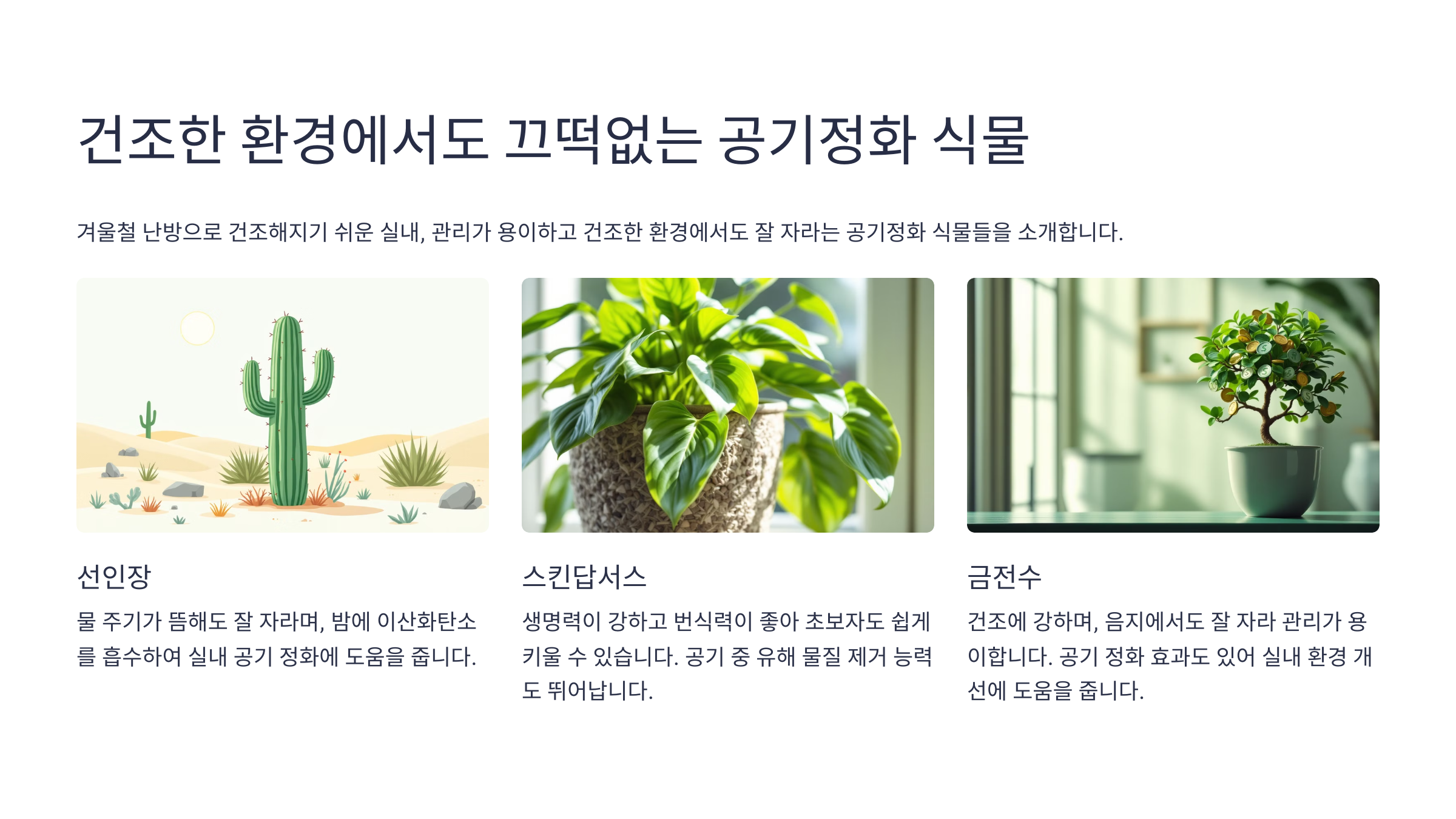 이 식물들은 겨울철 건조한 환경에서도 잘 자라기 때문에 관리 부담이 적어요. 특히, 물을 너무 자주 주지 않는 것이 건강하게 키우는 포인트랍니다.