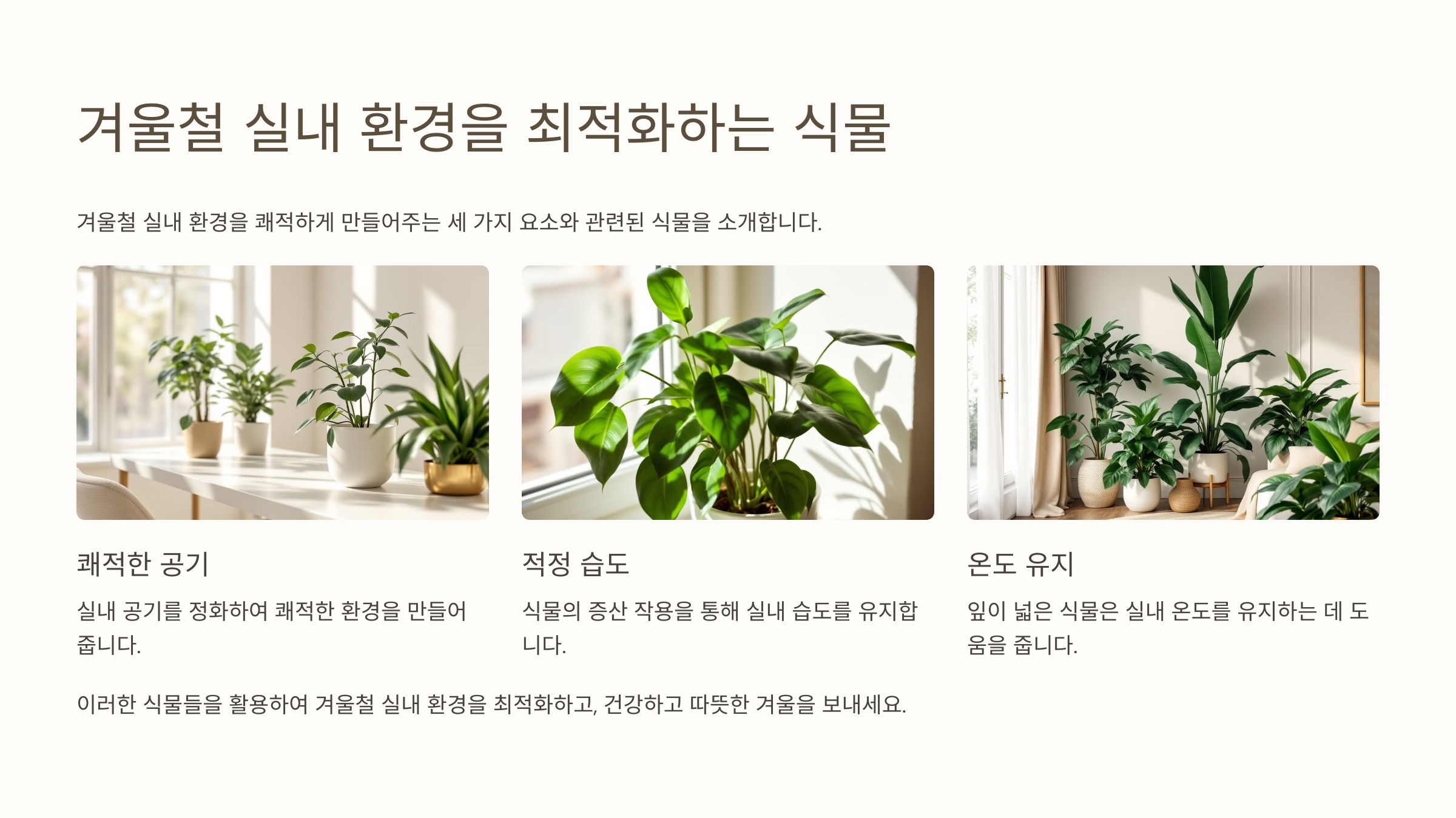 그럼, 겨울철 실내 환경을 최적화하는 데 도움이 되는 식물들을 정리해볼까요? 📌