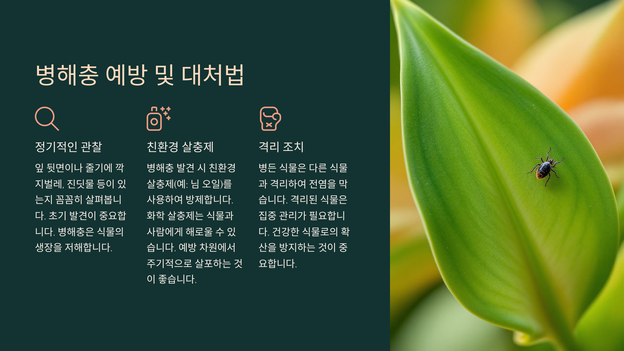 | 응애 | 건조한 환경 | 습도 유지, 잎에 분무 | 비누물이나 살충제 사용 |