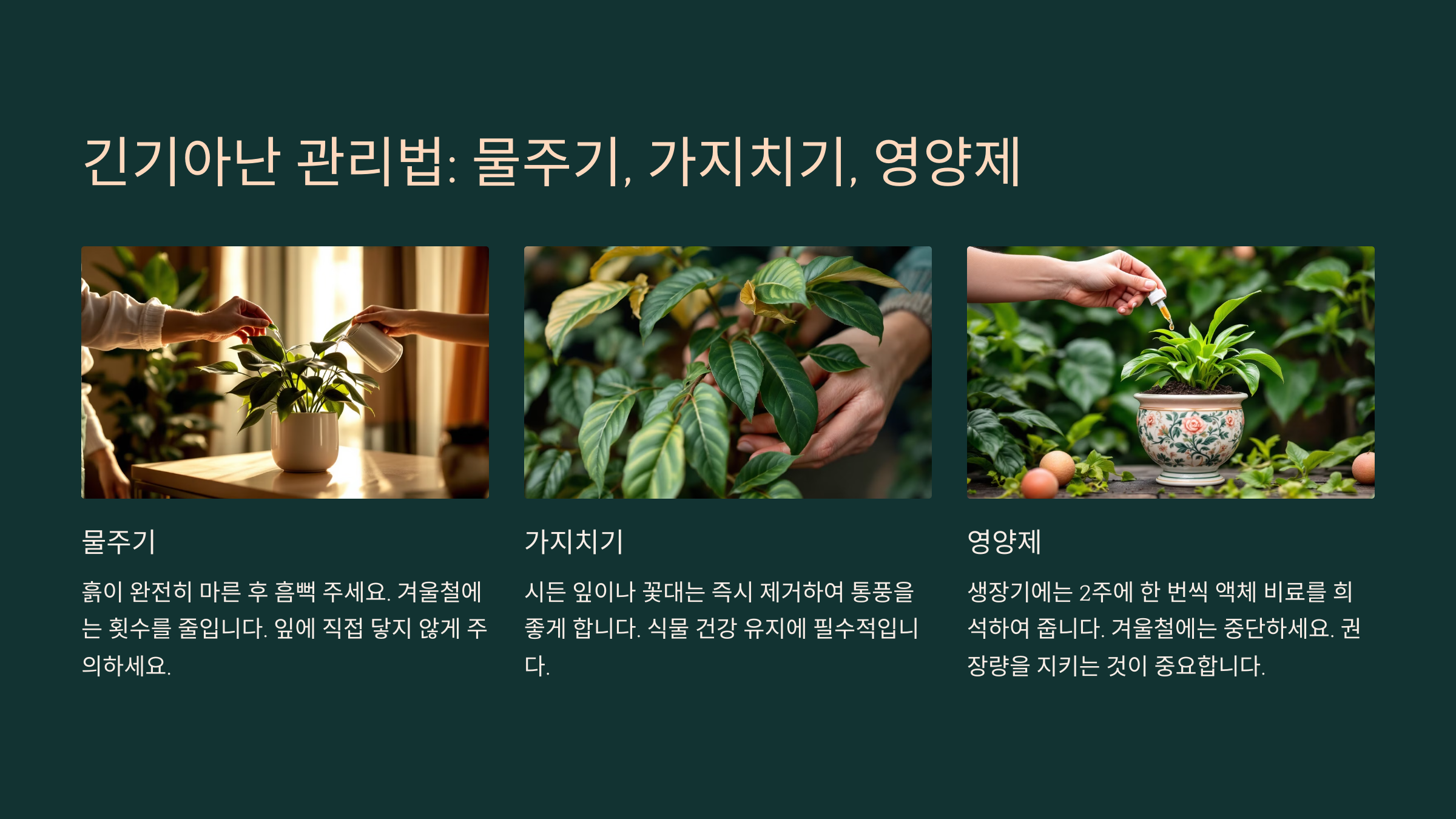 이제 물주기와 습도 조절 방법을 알았으니, 긴기아난 꽃을 더 싱그럽게 유지할 수 있어요! 🌸