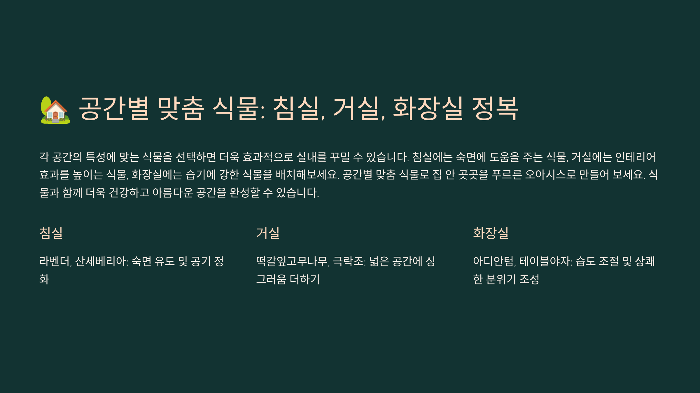 공간별로 적절한 식물을 선택하면 실내 환경이 더 쾌적해지고, 자연과 함께하는 기분을 느낄 수 있어요! 🌱