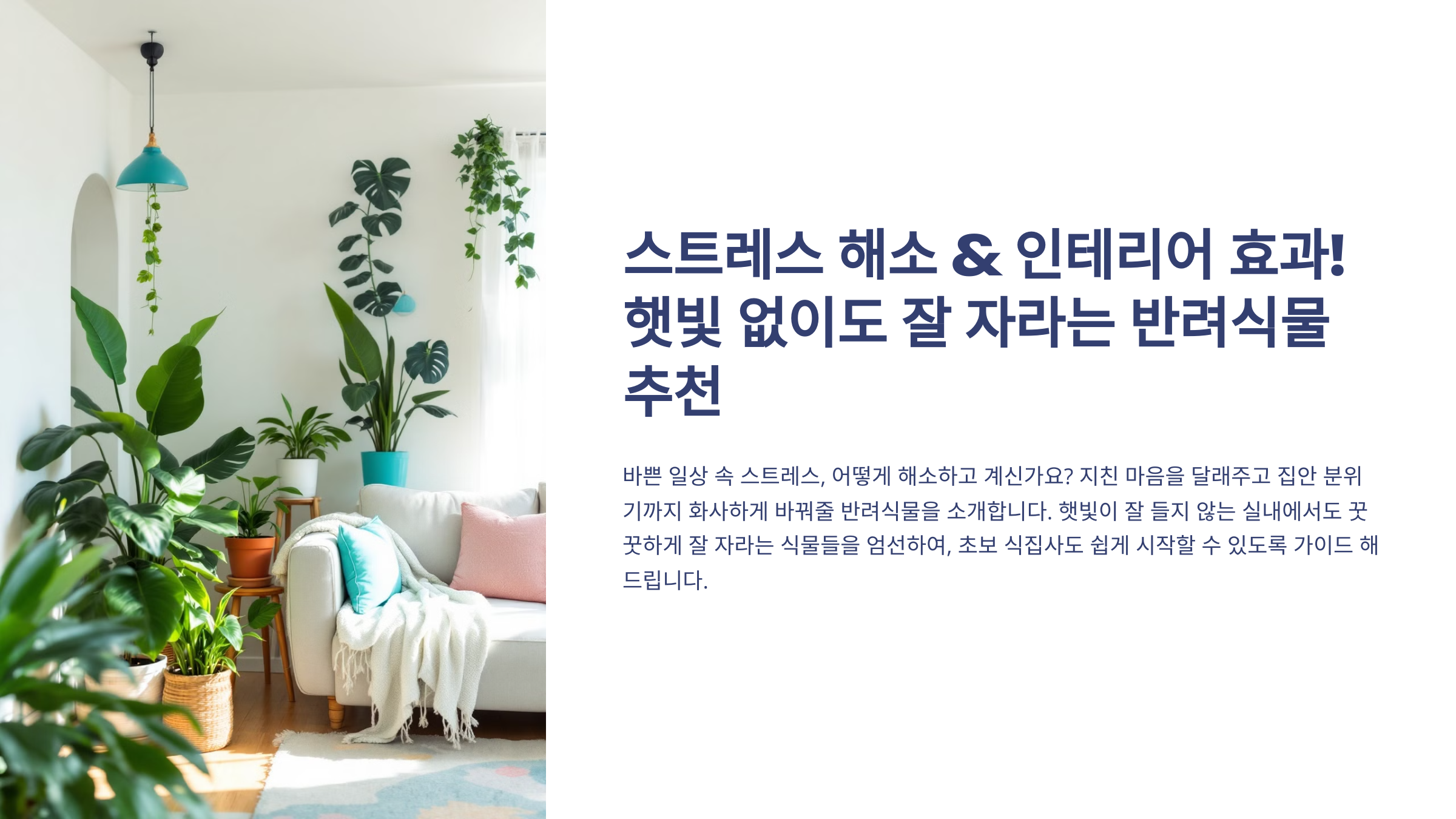 오늘은 **스트레스 해소에 좋은 식물부터, 햇빛 없이도 잘 자라는 식물, 인테리어 효과까지 뛰어난 식물**까지! 다양한 반려식물 추천 리스트를 준비했어요. 😊