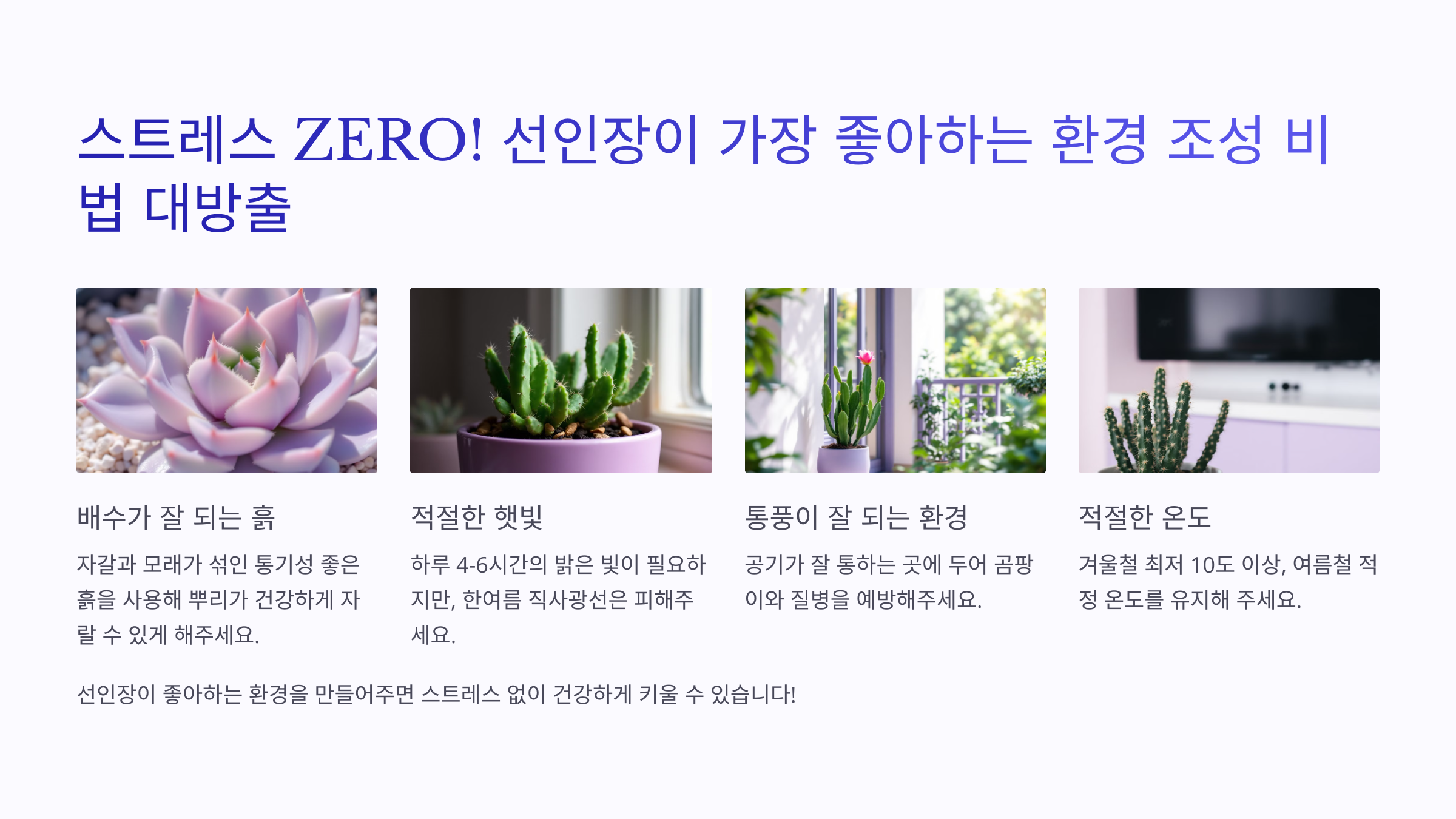 선인장도 스트레스를 받으면 성장이 멈추거나 병에 걸릴 수 있어요. 아래 조건을 맞춰주면 선인장이 더 건강하게 자랄 수 있어요.