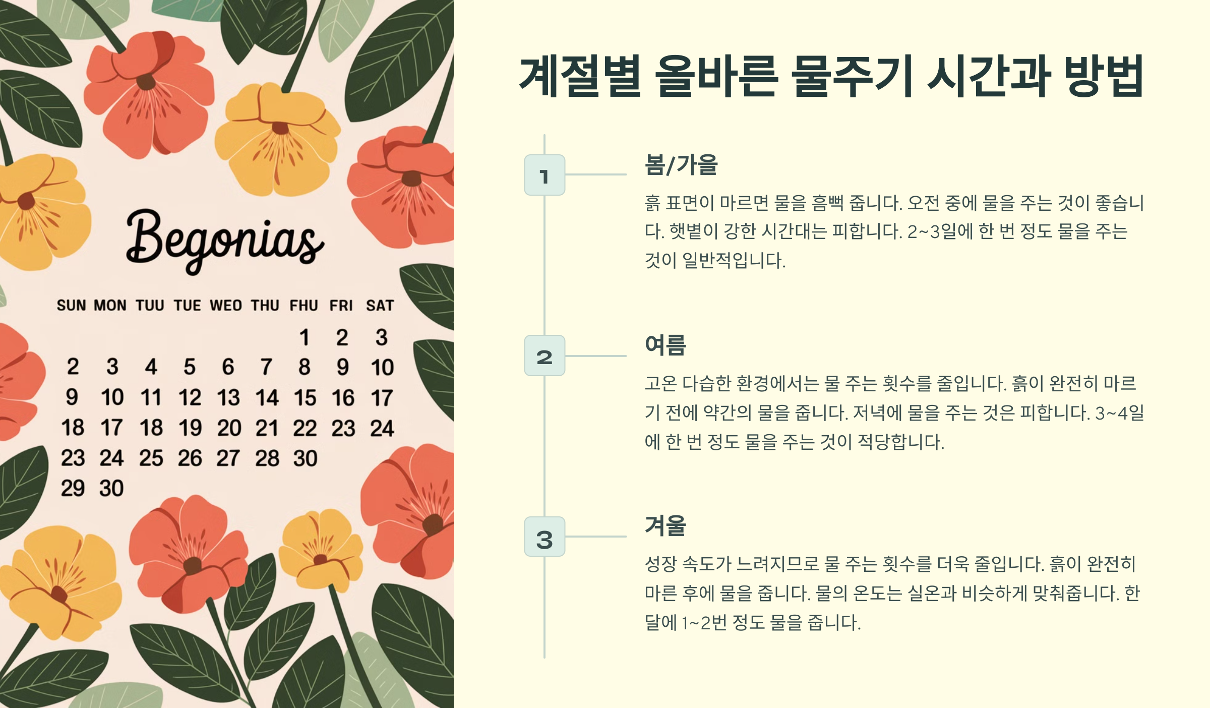 🌙 **저녁 물주기는 피하세요!** 밤에 물을 주면 화분에 물이 오래 남아 뿌리가 썩을 위험이 있어요. 특히 베고니아는 과습에 취약한 식물이기 때문에 저녁보다는 아침에 물을 주는 것이 좋아요.