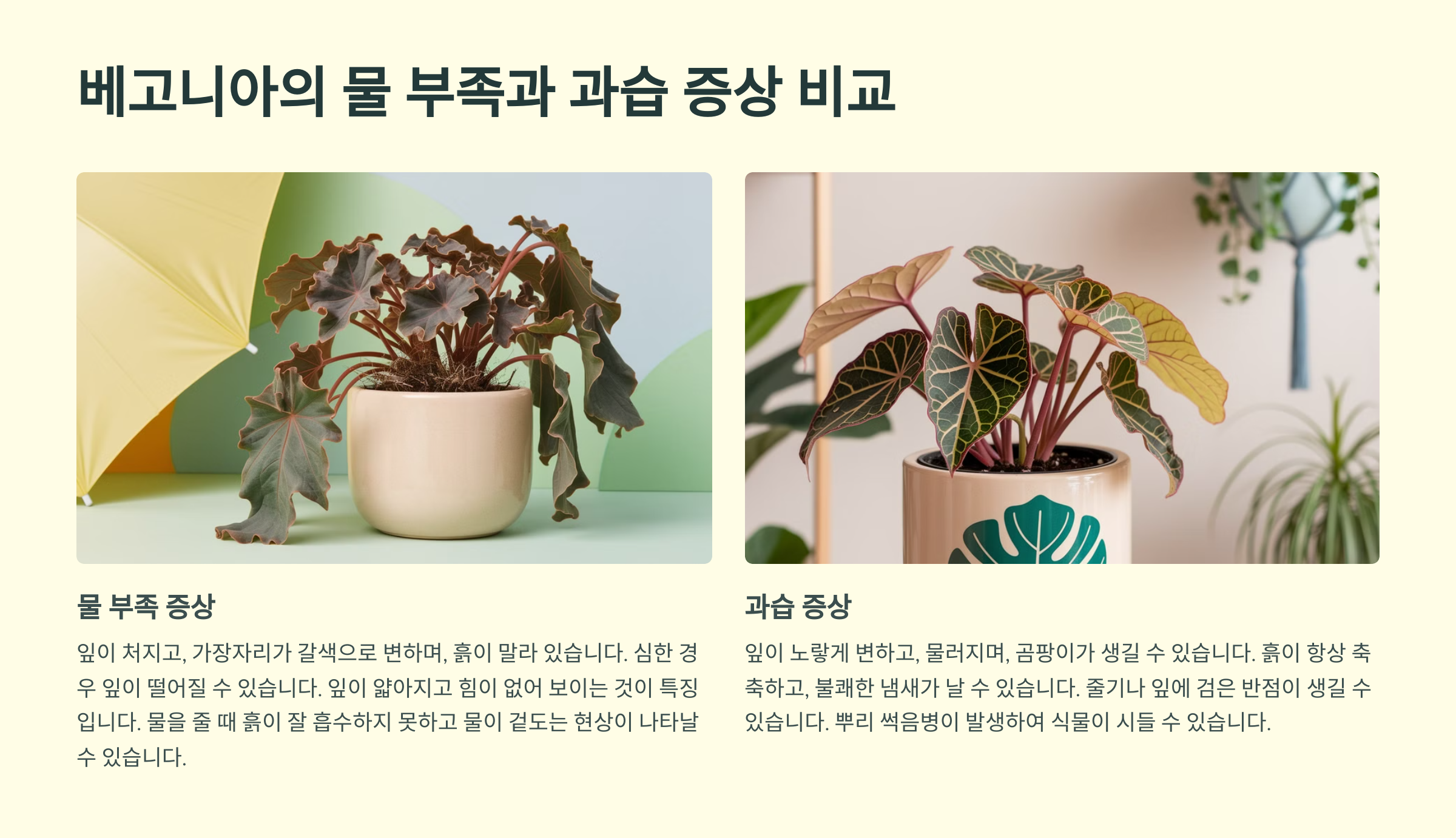 베고니아는 물 부족과 과습에 민감한 식물이기 때문에, 증상을 잘 구별하는 것이 중요해요. 두 가지 경우 모두 잎이 변색되거나 시들 수 있지만, 원인과 해결 방법이 완전히 다르답니다.
