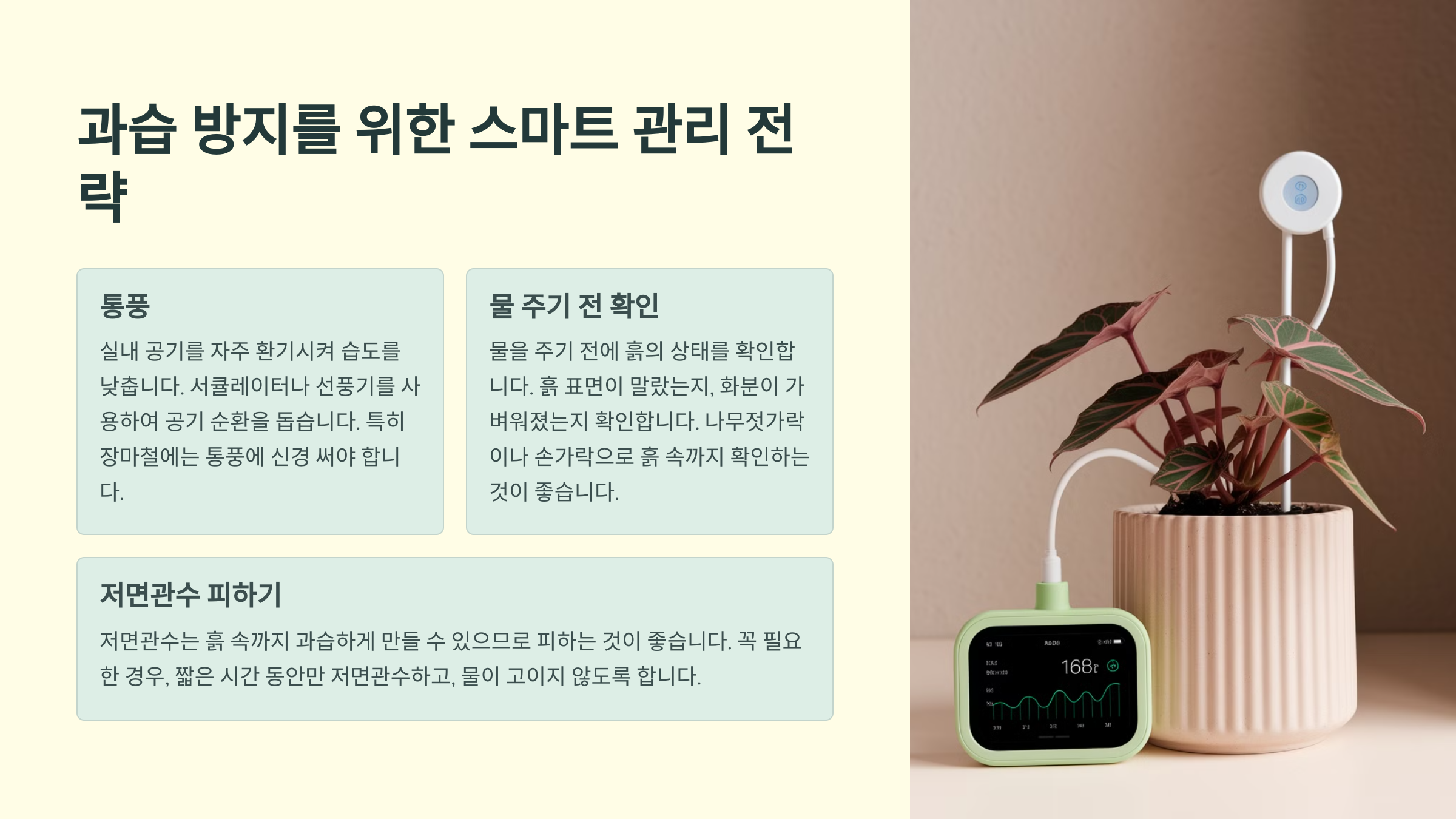 과습을 방지하려면 물주기 전에 흙의 상태를 꼭 확인해야 해요. 손가락을 흙에 넣어 2~3cm 깊이가 마르면 물을 주는 것이 가장 좋아요.