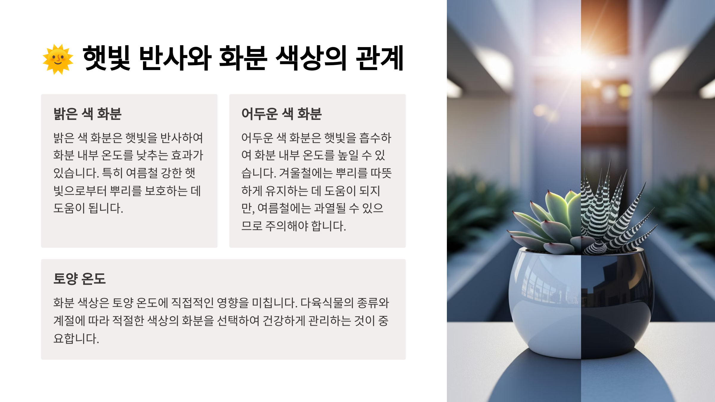 | 화분 색상 | 햇빛 반사율 | 추천 환경 |