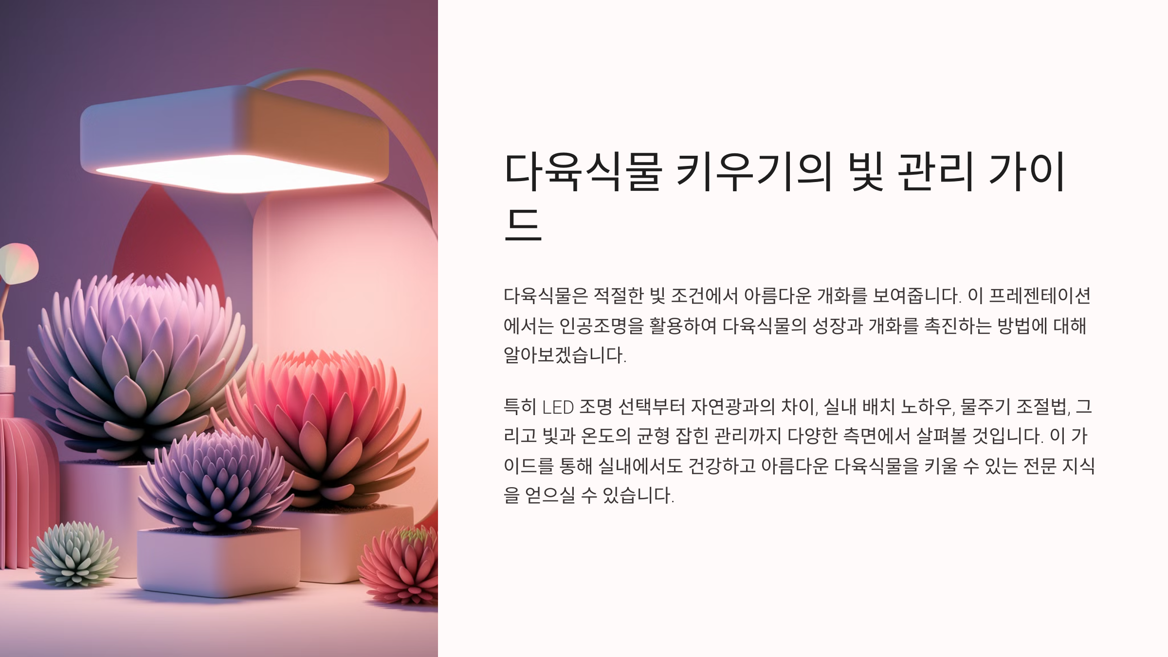 제가 생각했을 때, 인공조명을 잘 활용하면 자연광이 부족한 환경에서도 충분히 다육식물을 키울 수 있어요. 하지만 아무 조명이나 사용하면 안 되고, 빛의 강도와 스펙트럼, 조명 시간 등을 적절히 조절해야 해요. 오늘은 인공조명을 활용해 다육식물을 키우고 꽃을 피울 수 있는 방법을 자세히 알아볼게요. 🌸
