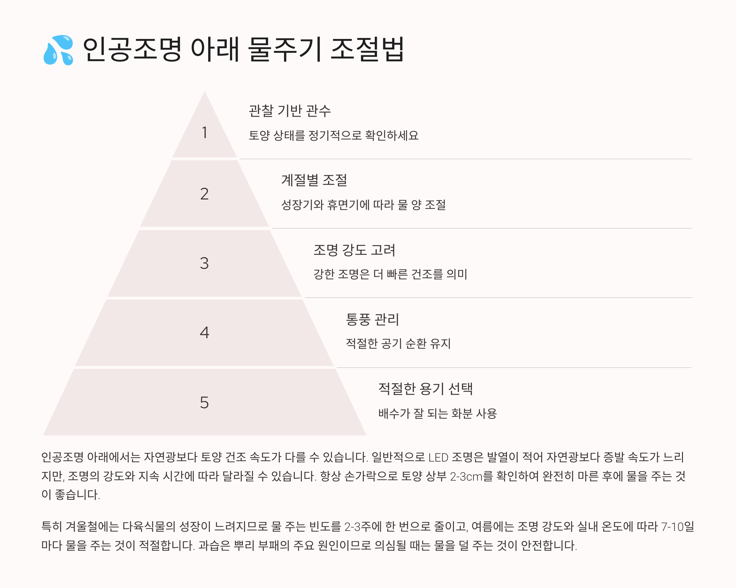 이제 조명을 잘 배치했다면, 물 주는 방법도 신경 써야 해요. 💦 다음 섹션에서 인공조명 아래에서의 물주기 방법을 알아볼까요? 😊