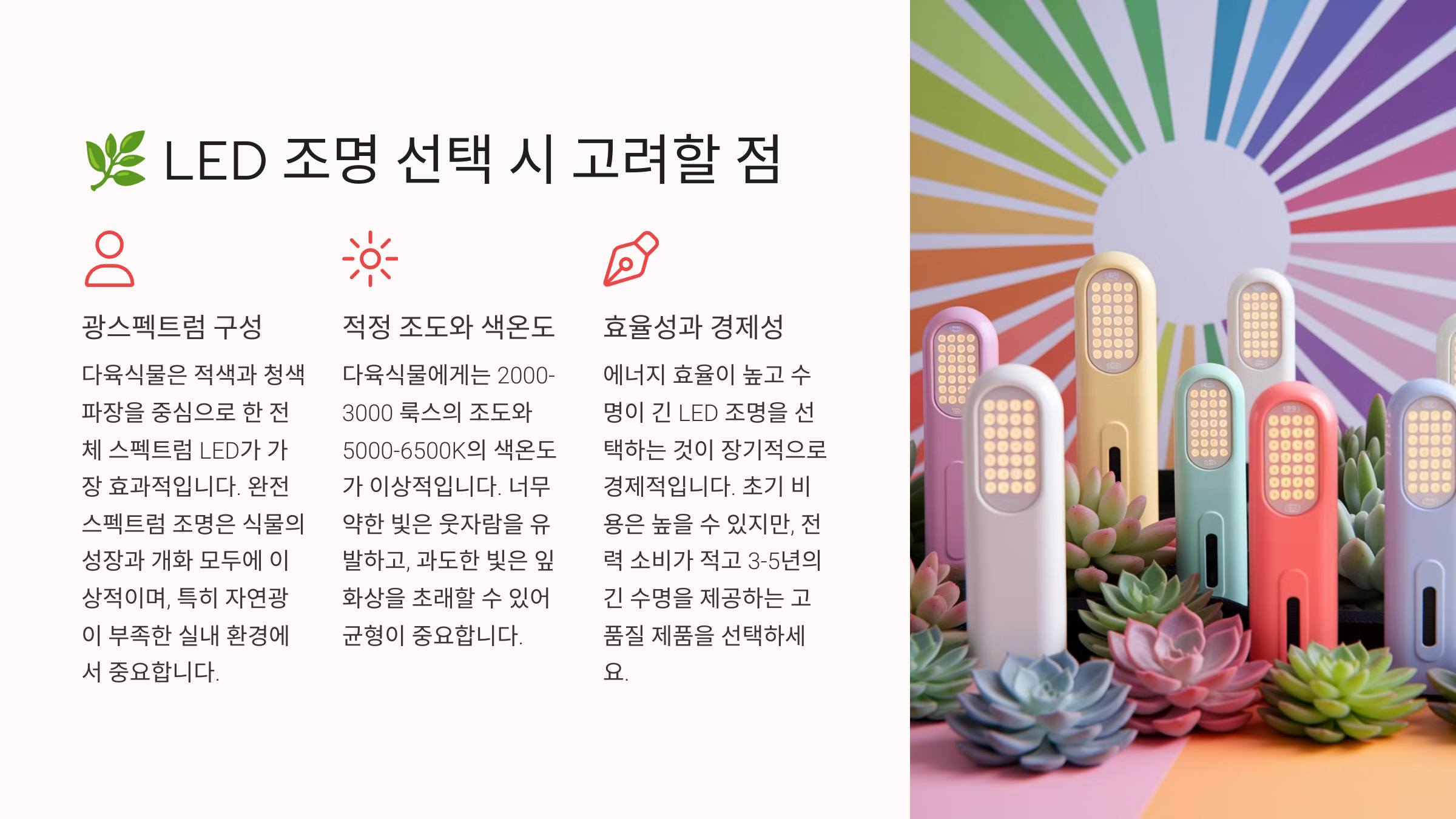 인공조명을 활용해 다육식물을 키울 때, 어떤 LED 조명을 선택해야 할까요? 다양한 옵션이 있지만, 몇 가지 중요한 요소를 고려해야 해요. 💡