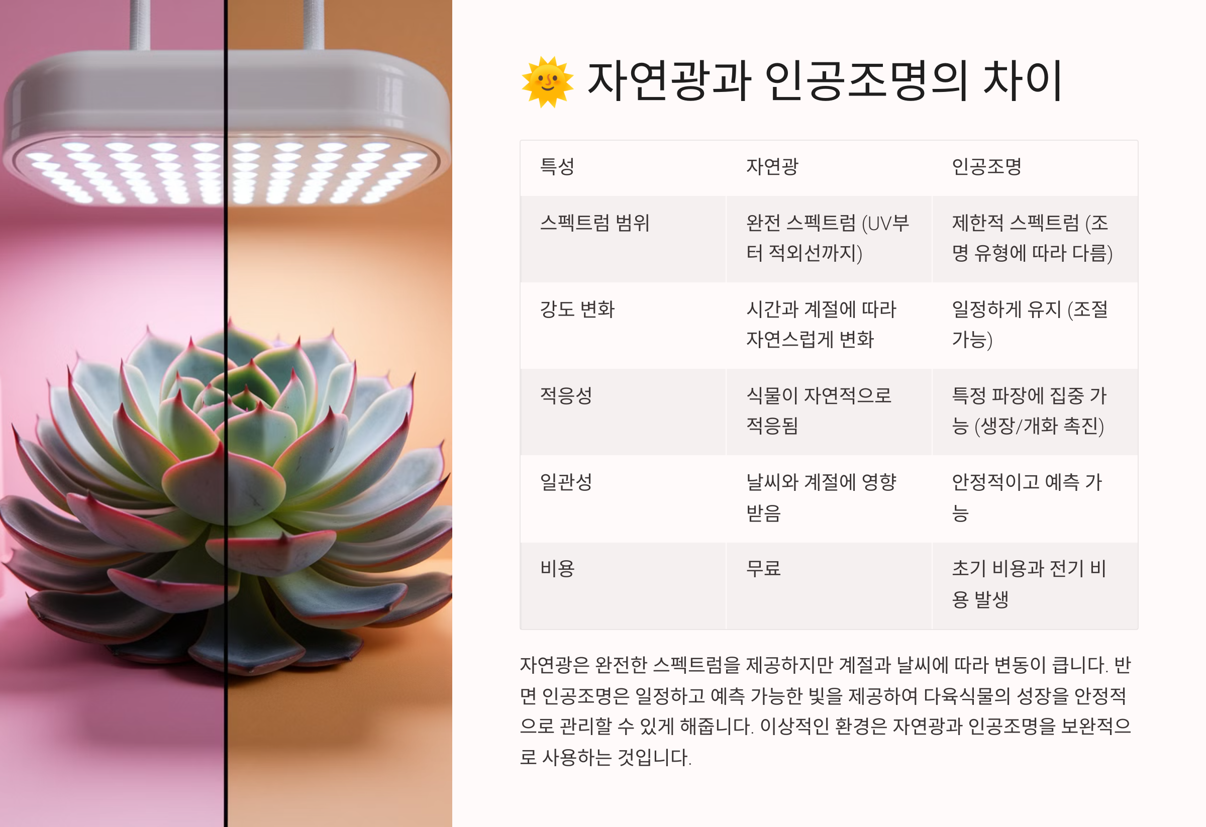 | 구분 | 자연광 ☀️ | 인공조명 💡 |