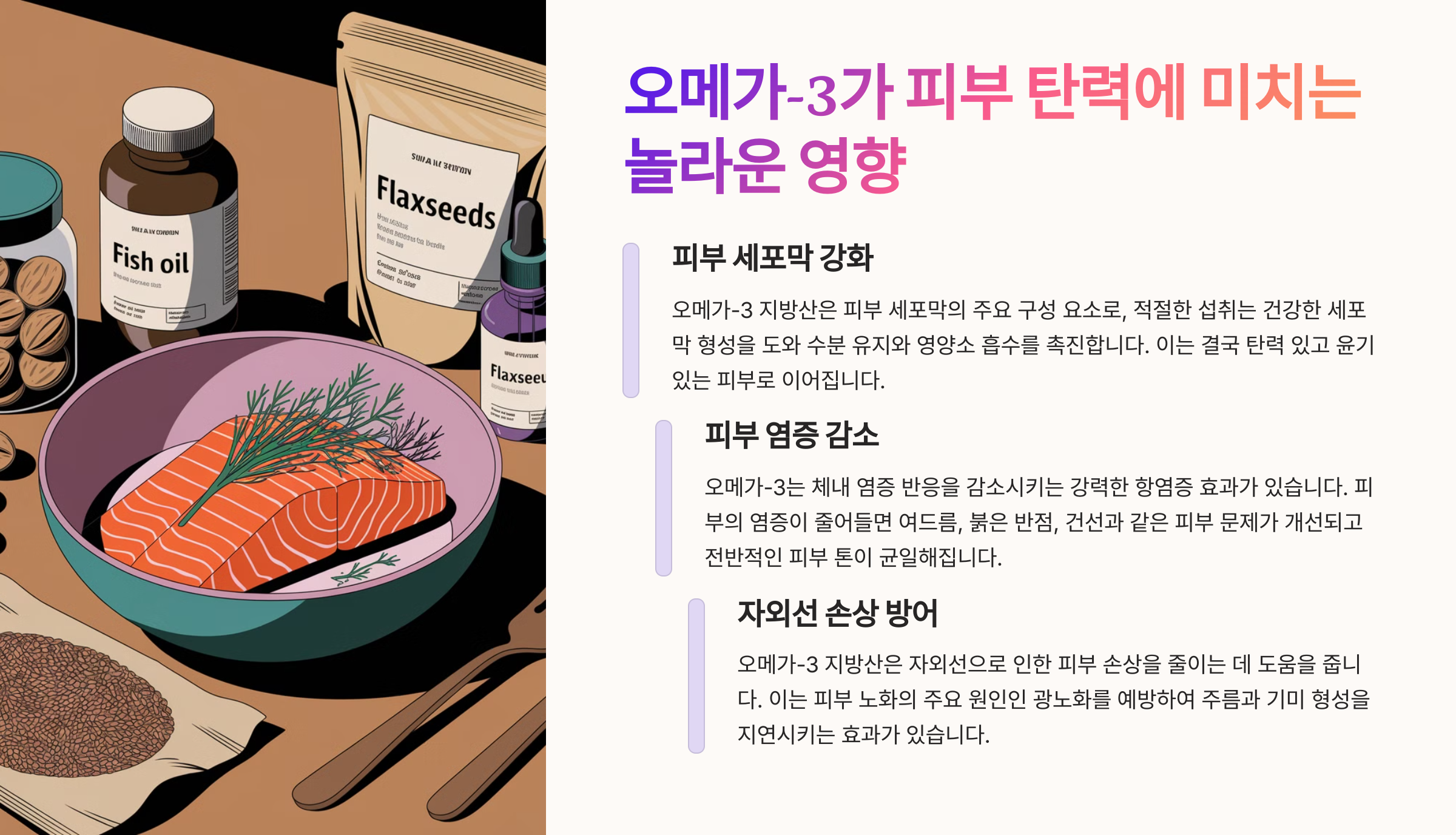 오메가3는 단순히 피부 탄력뿐만 아니라 전반적인 피부 건강에도 많은 도움을 줘요. 식단에 꾸준히 포함하면 피부가 더 촉촉하고 탄탄해지는 걸 느낄 수 있을 거예요! 😉