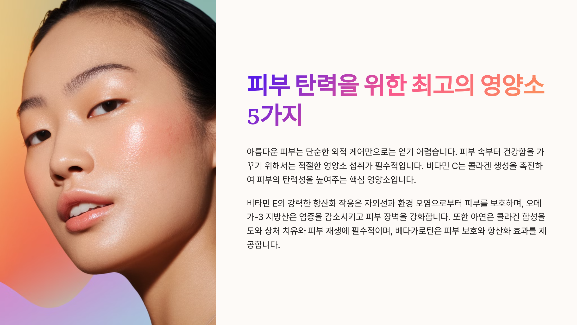 피부 탄력을 유지하는 데 중요한 역할을 하는 영양소와 음식을 꾸준히 섭취하면 피부가 건강하고 탄탄해질 수 있어요. 내가 생각했을 때, 스킨케어 제품만큼이나 식단 관리가 중요한 이유는 피부 속부터 건강한 변화를 이끌어낼 수 있기 때문이에요.