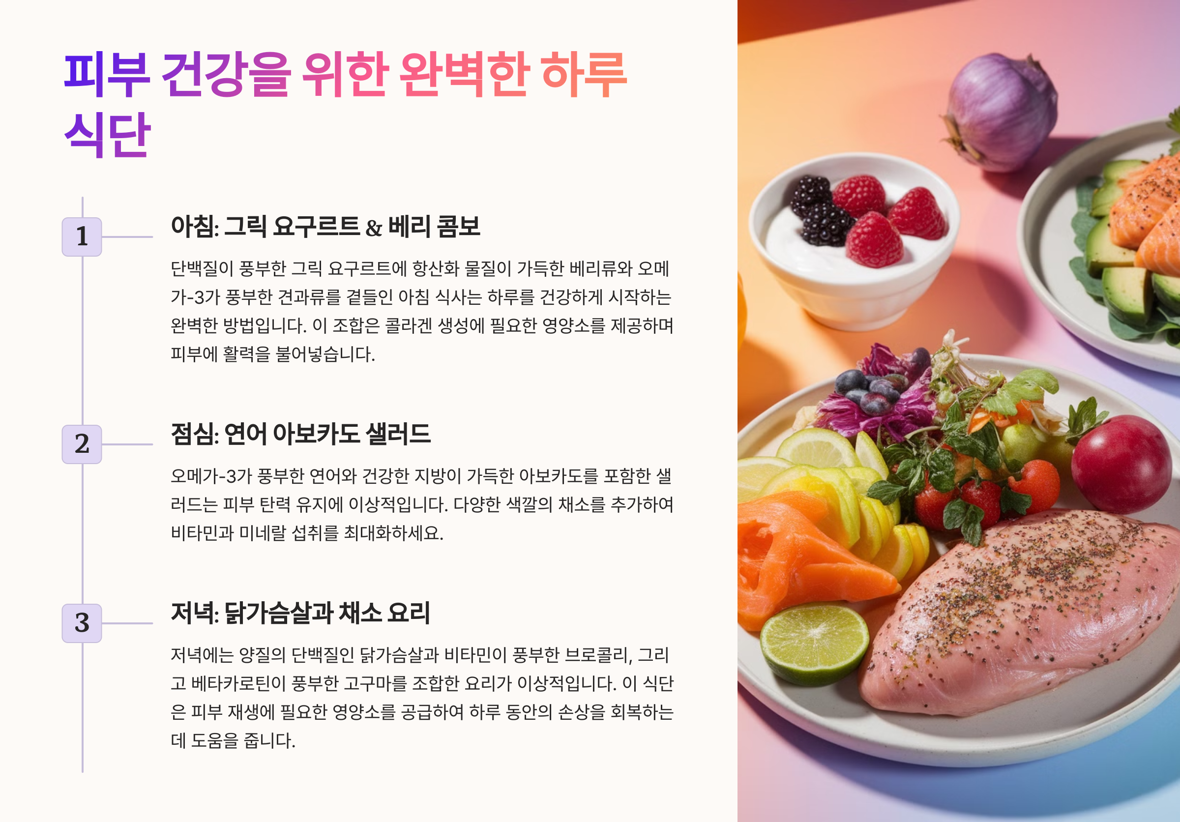 아침, 점심, 저녁을 어떻게 먹느냐에 따라 피부 탄력이 달라질 수 있어요. 아래 식단을 참고해 실천해 보세요! 😊