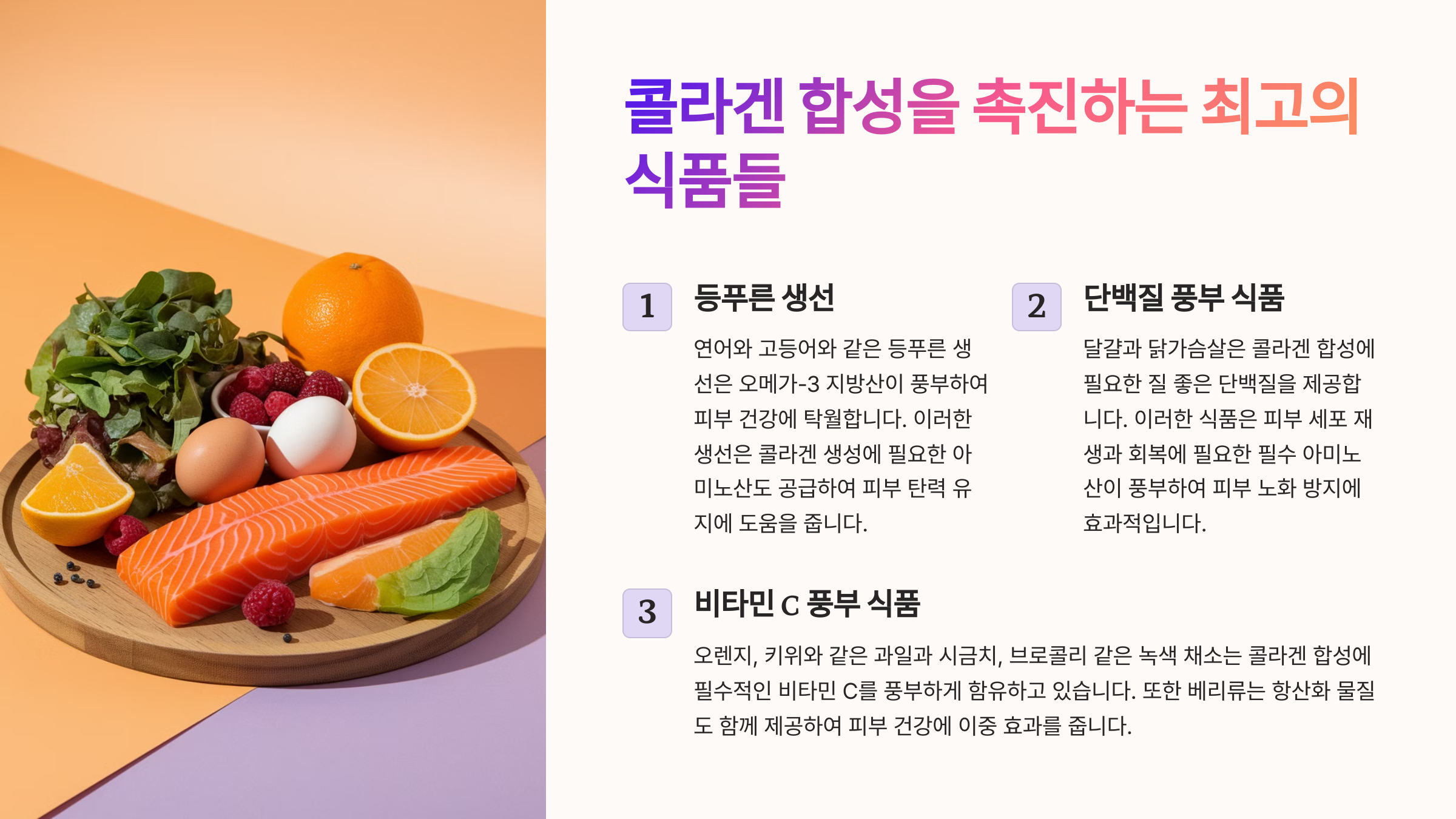 콜라겐은 피부 탄력을 유지하는 데 필수적인 단백질이에요. 하지만 나이가 들면서 체내 콜라겐 생성량이 줄어들기 때문에, 콜라겐 합성을 돕는 음식을 꾸준히 섭취하는 것이 중요해요! 🍖🥚