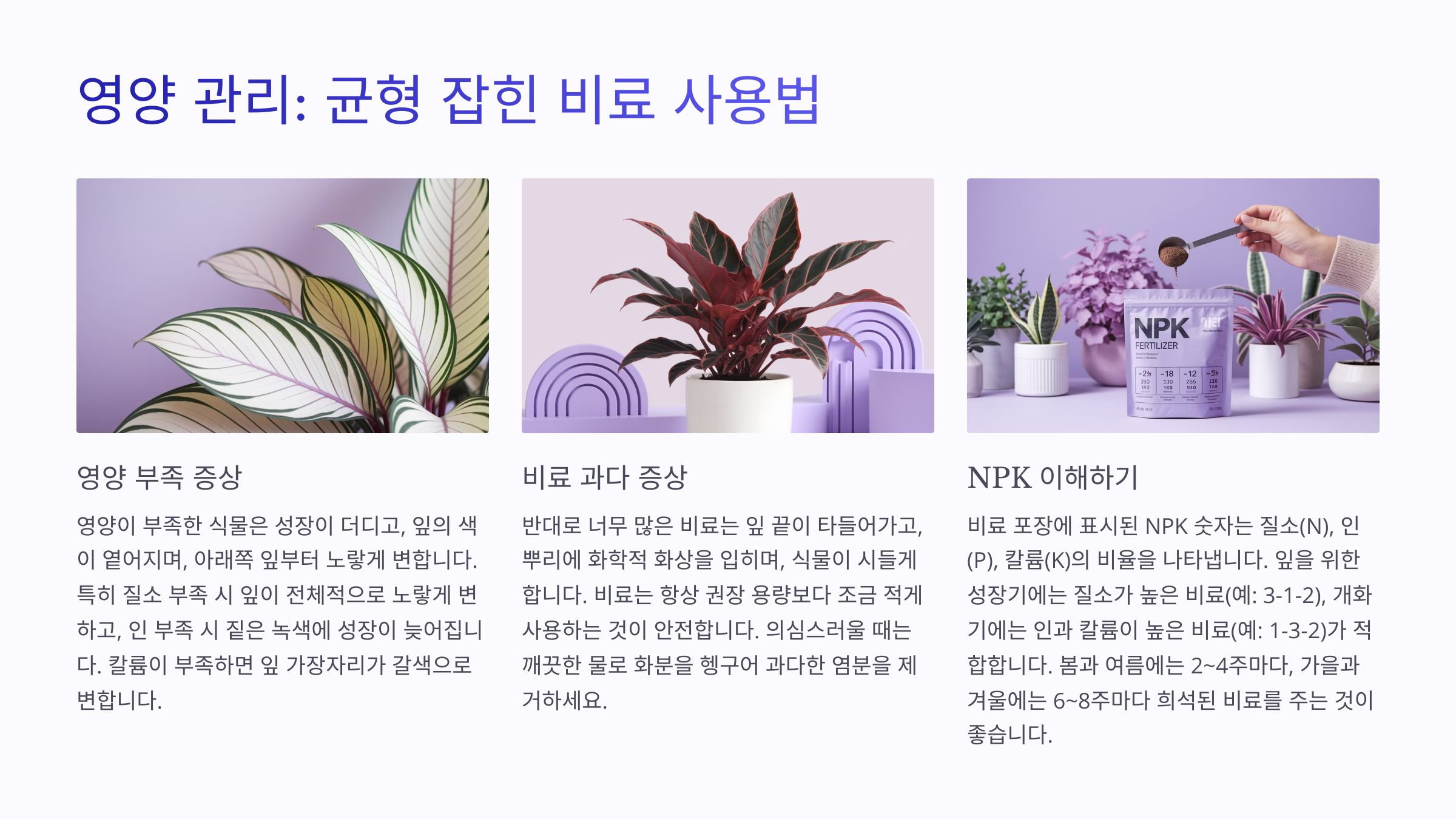 | 액체비료 | 물을 섞어 2~4주에 한 번 사용 | 너무 자주 주면 뿌리 손상 위험 |