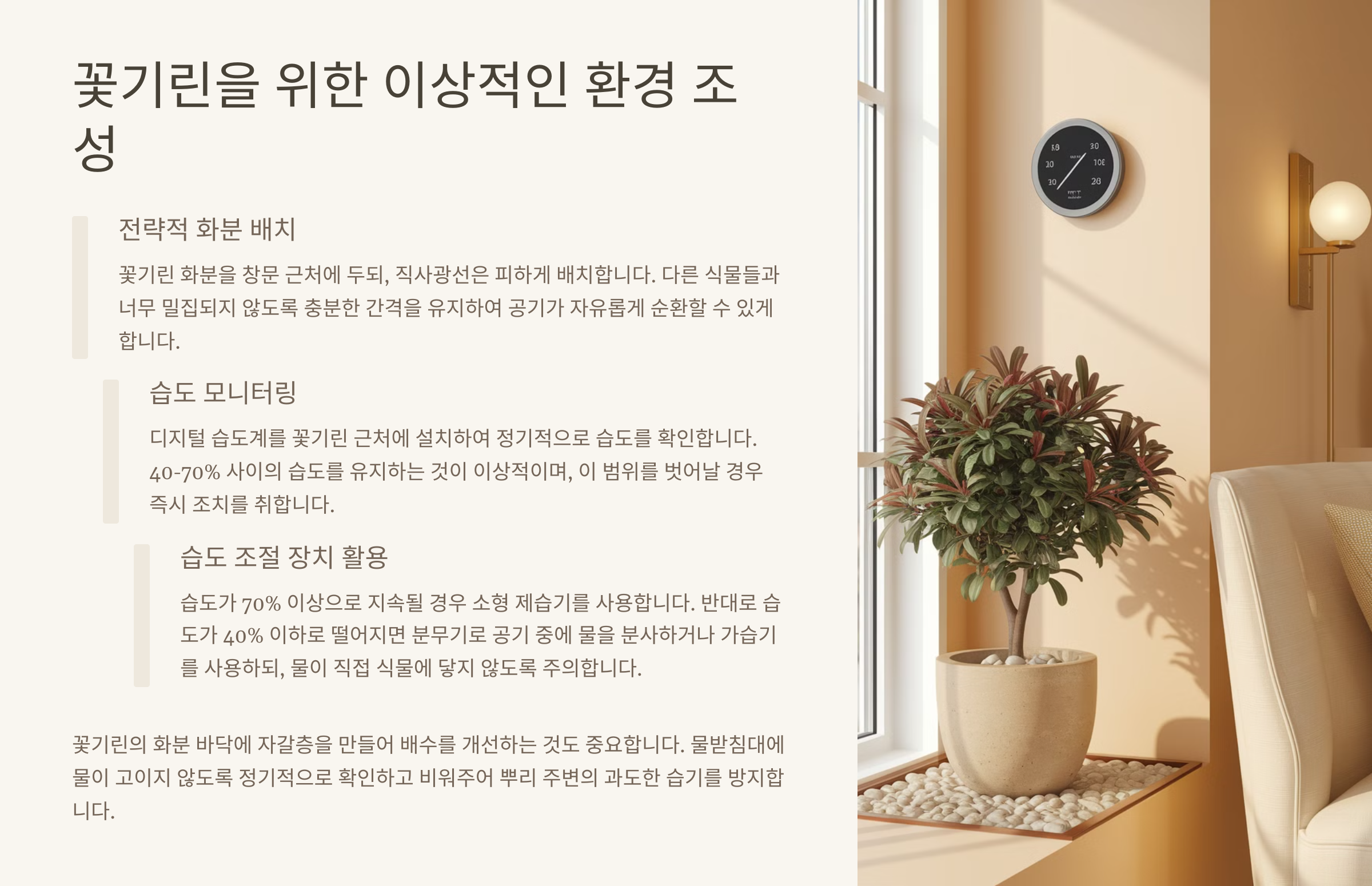 꽃기린은 적절한 습도를 유지해야 건강하게 자랄 수 있어요. 습도가 너무 높으면 곰팡이와 뿌리 썩음이 발생할 수 있고, 너무 낮으면 잎이 마르고 끝이 갈색으로 변할 수 있어요.