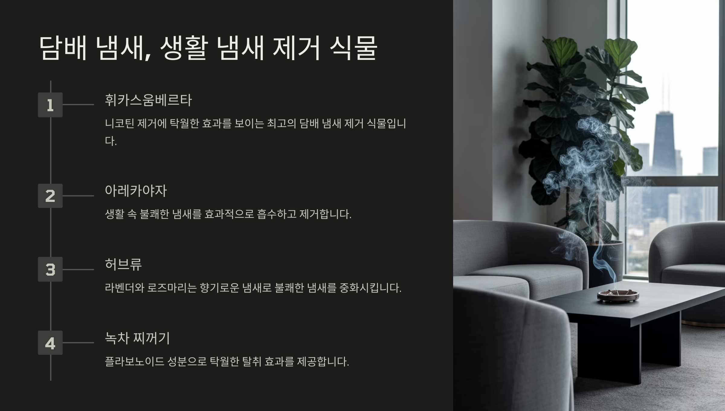 그럼 다음으로, **담배 냄새와 생활 냄새를 제거하는 식물**을 알아볼까요? 🚬💨
