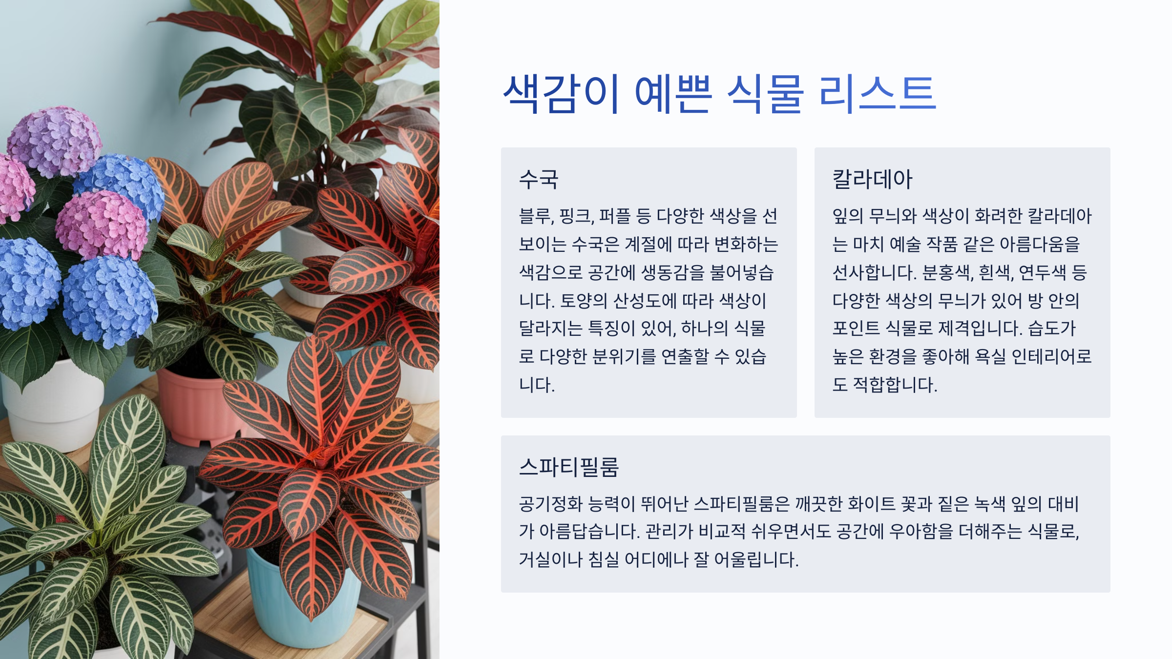 다음은 **색감이 아름답고 인테리어 효과가 뛰어난 식물 BEST 5**입니다! 🌈✨