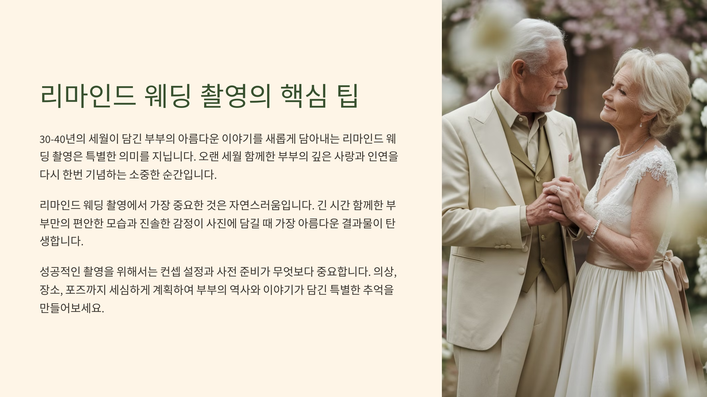 내가 생각했을 때, 가장 중요한 것은 두 사람이 원하는 스타일을 정확히 정하는 거예요. 트렌드도 중요하지만 부부가 가장 자연스럽게 어울리는 분위기를 선택해야 만족스러운 결과를 얻을 수 있어요.