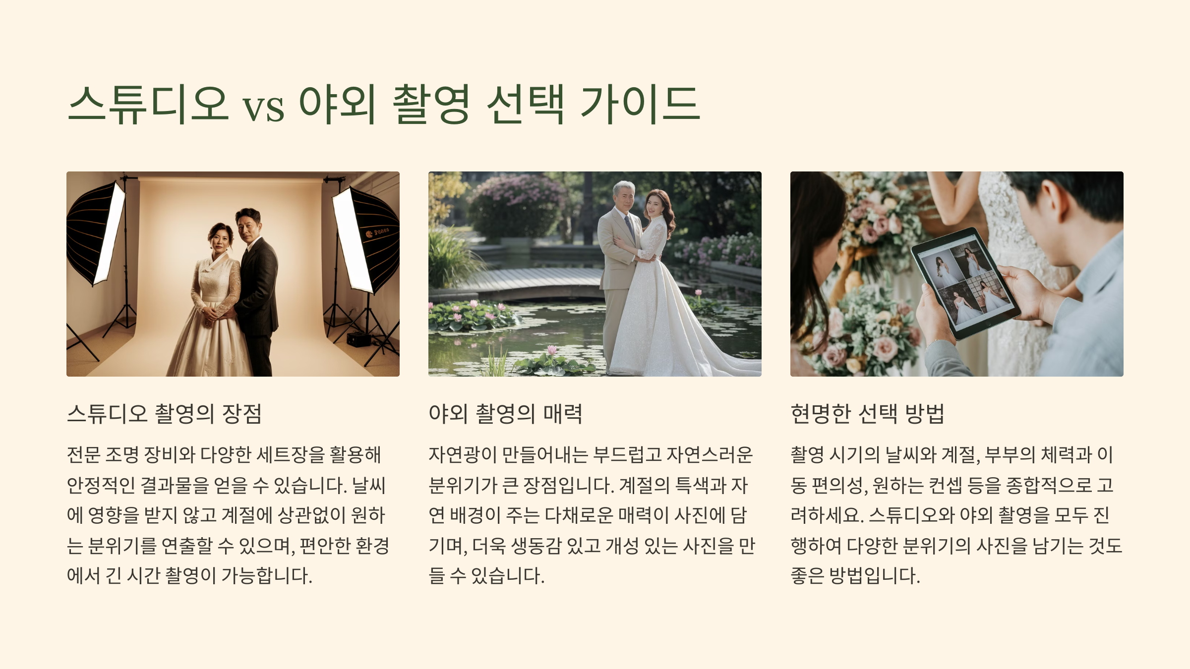 | 스튜디오 | 날씨 영향 없음, 깔끔한 배경, 컨셉 구현 용이 | 자연스러운 분위기 부족, 배경이 제한적 |