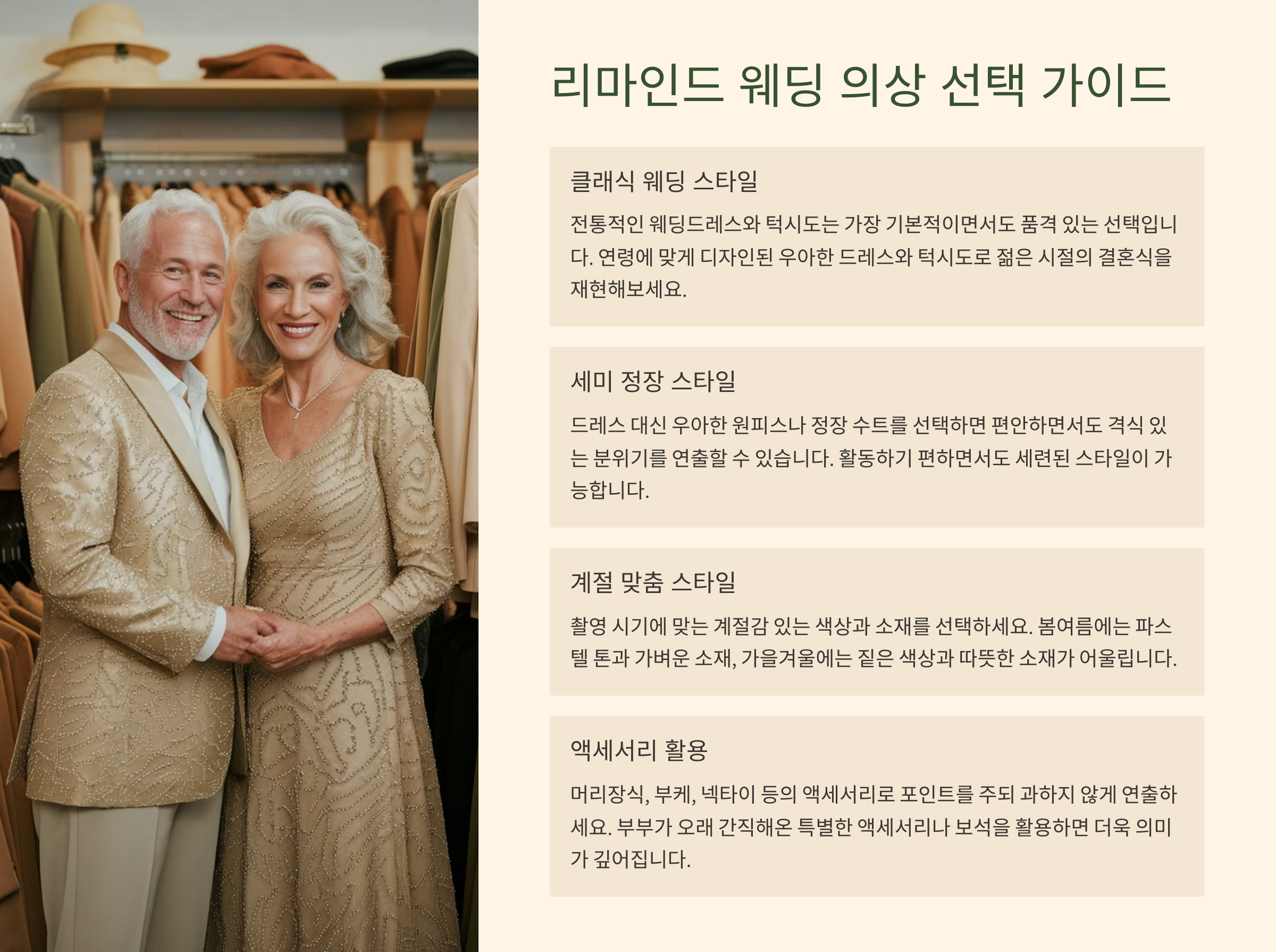 다음 섹션에서는 리마인드 웨딩 촬영 시 어떤 의상을 선택해야 하는지 알아볼게요! 🎩👗