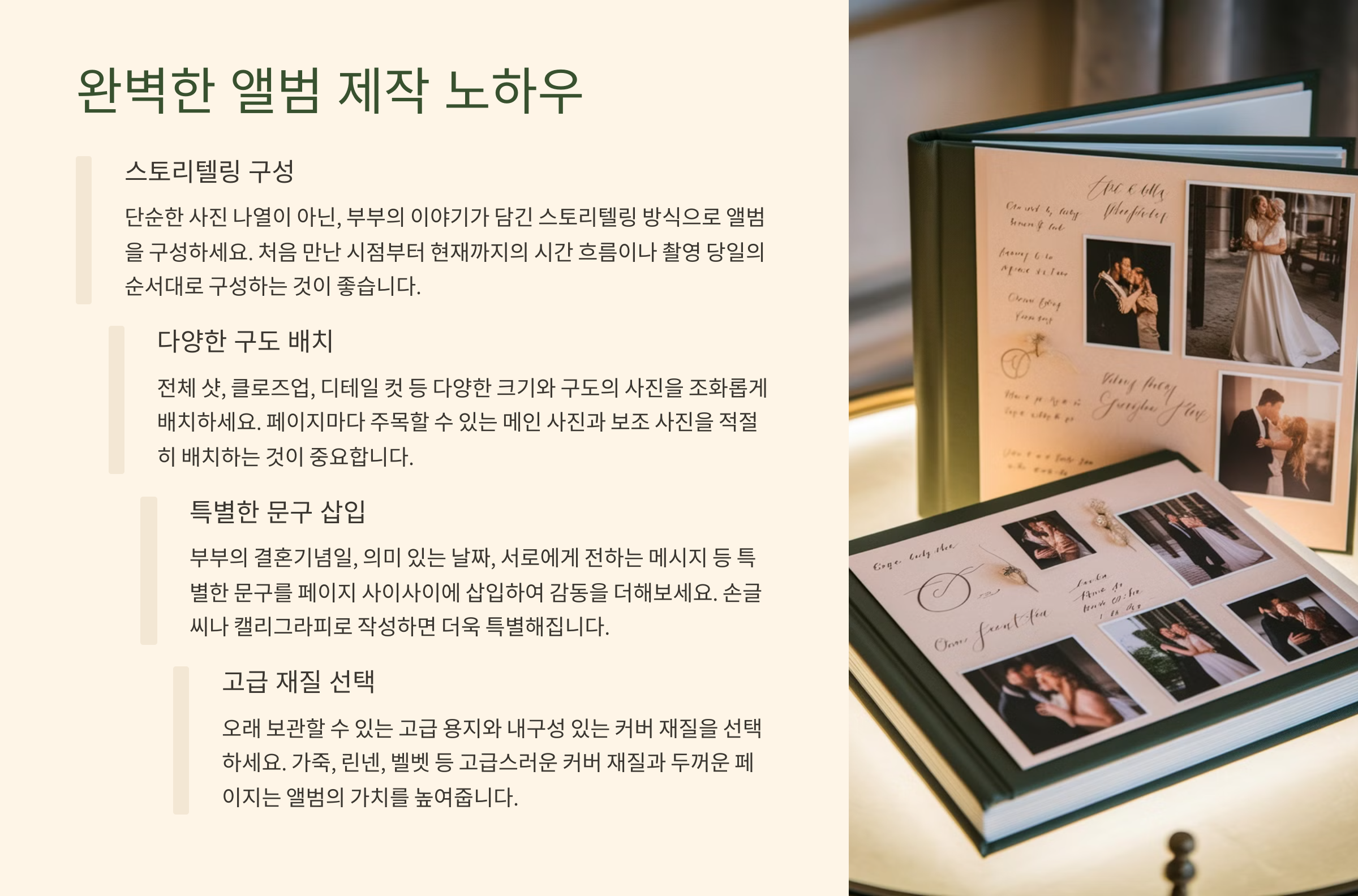 앨범을 제작할 때는 단순히 예쁜 사진을 나열하는 것이 아니라, 하나의 이야기처럼 흐름을 구성하는 것이 중요해요. 처음엔 설레는 눈빛, 중간엔 즐거운 웃음, 마지막엔 감동적인 포옹처럼 자연스럽게 이어지는 구성이 좋답니다.