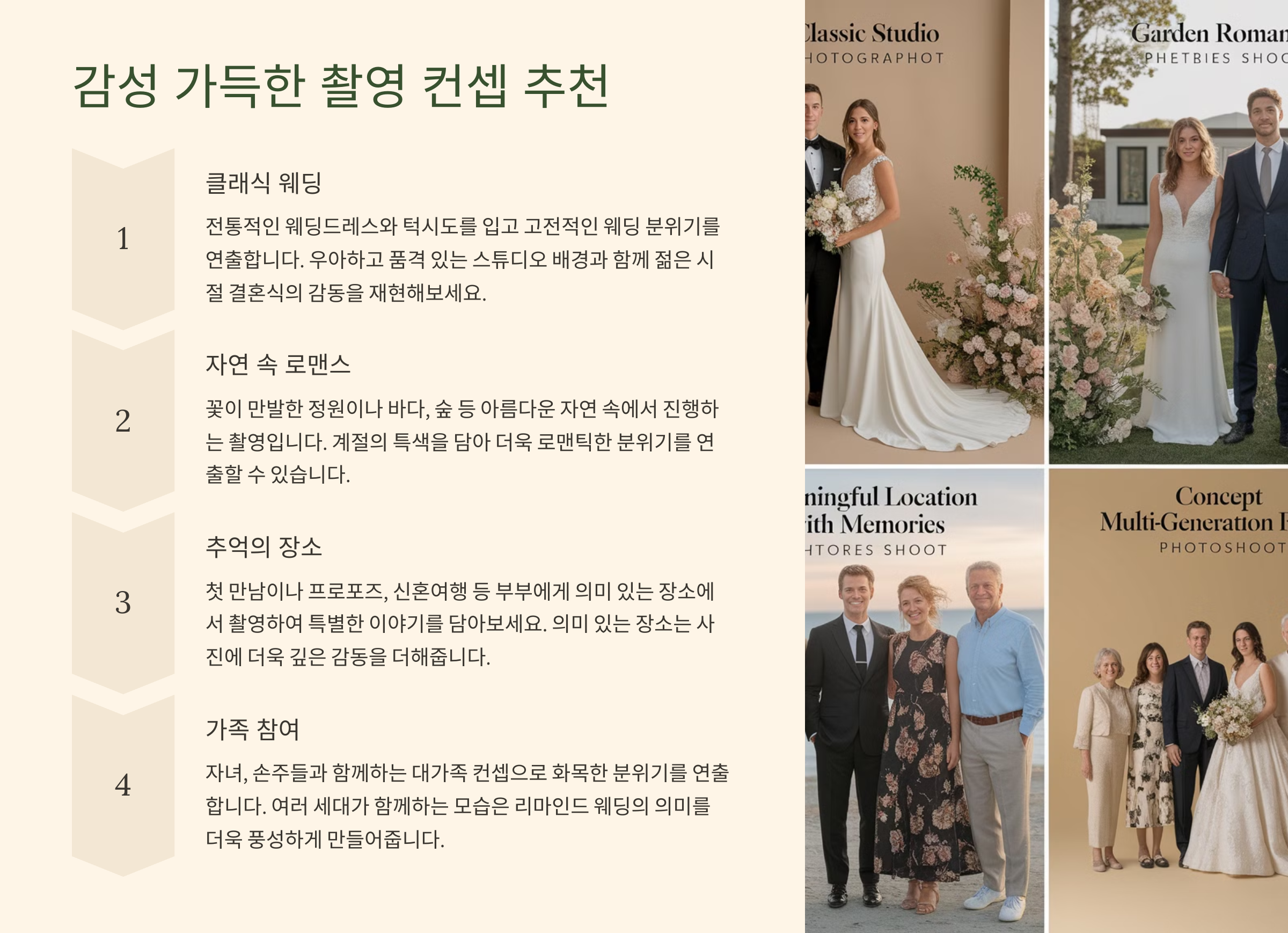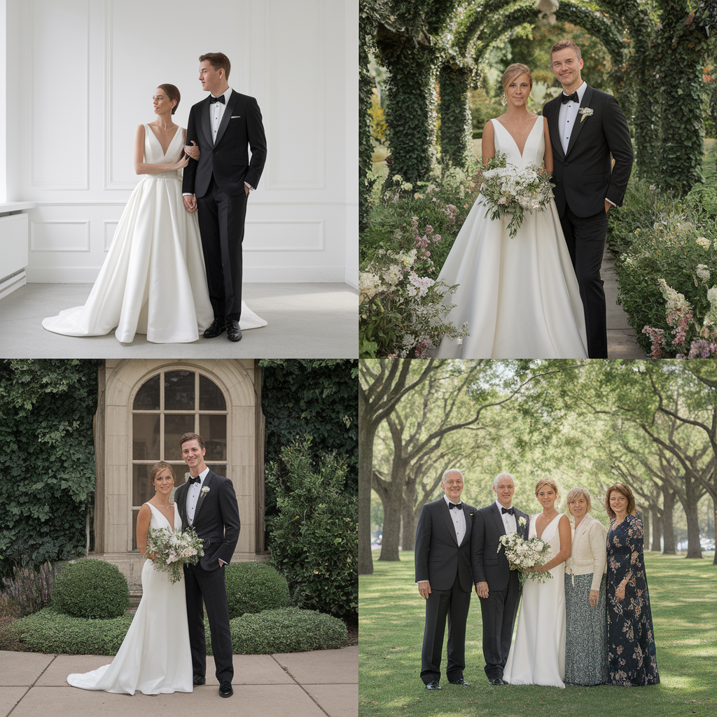 | 클래식 웨딩 | 고급스러운 정장과 드레스 스타일 | 실내 스튜디오, 고풍스러운 호텔 |