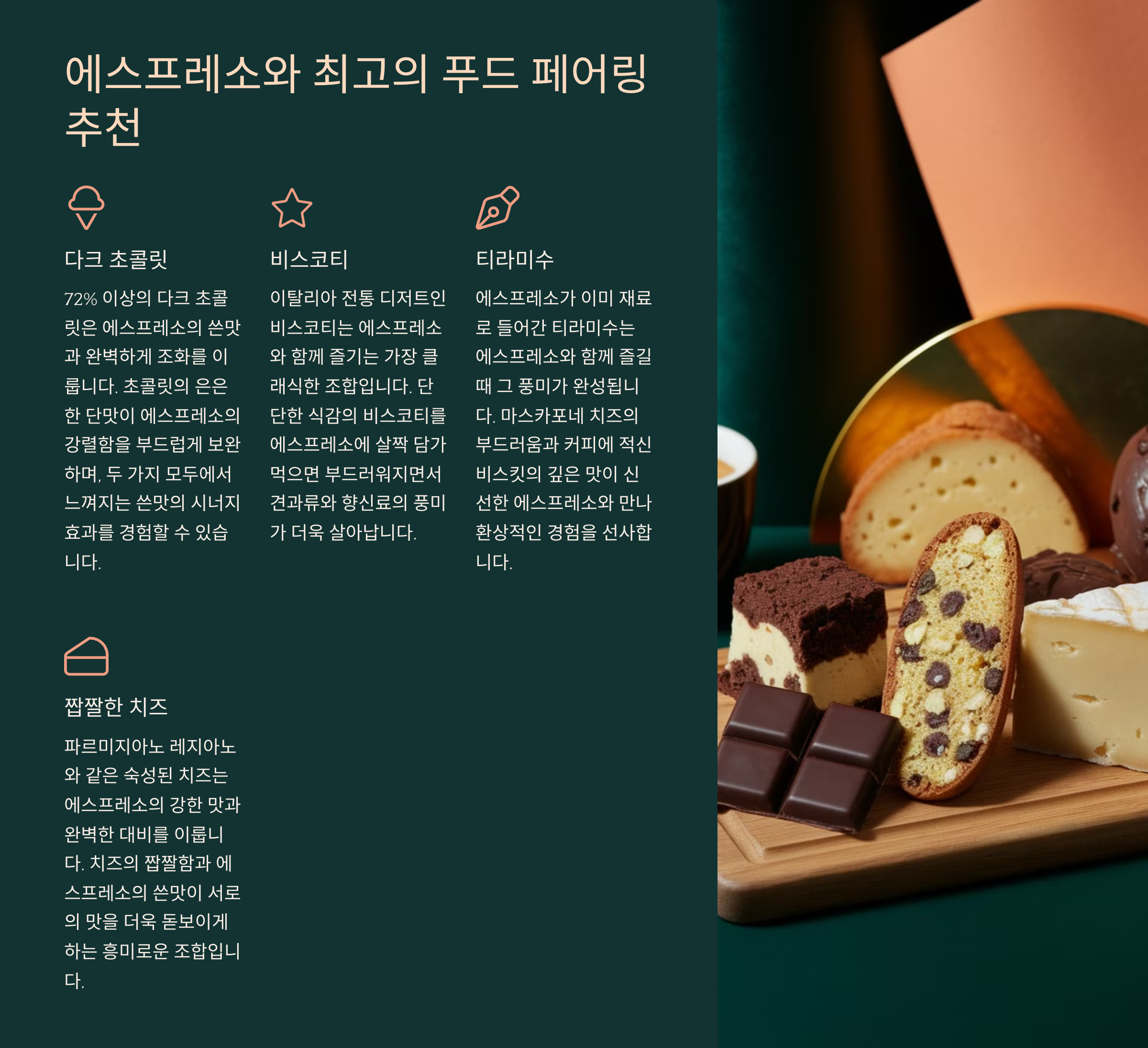 | 다크 초콜릿 | 카카오 70% 이상의 진한 맛 | 커피의 쓴맛과 깊은 조화를 이룸 |