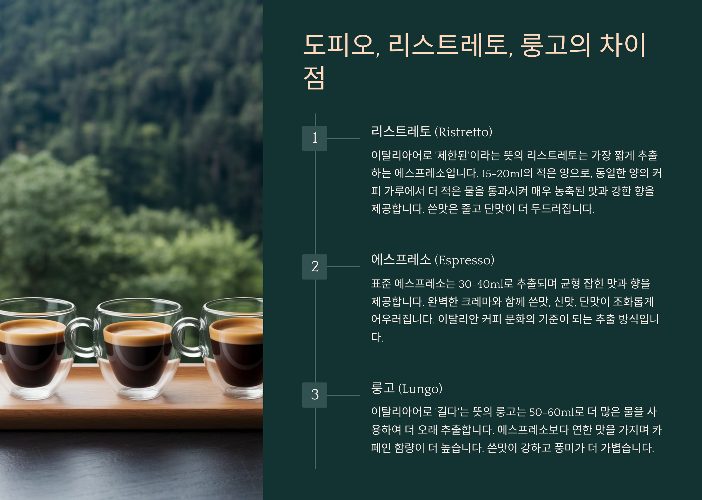 | 도피오 | 더블 샷 (1:2 비율) | 카페인↑, 강한 바디감 |