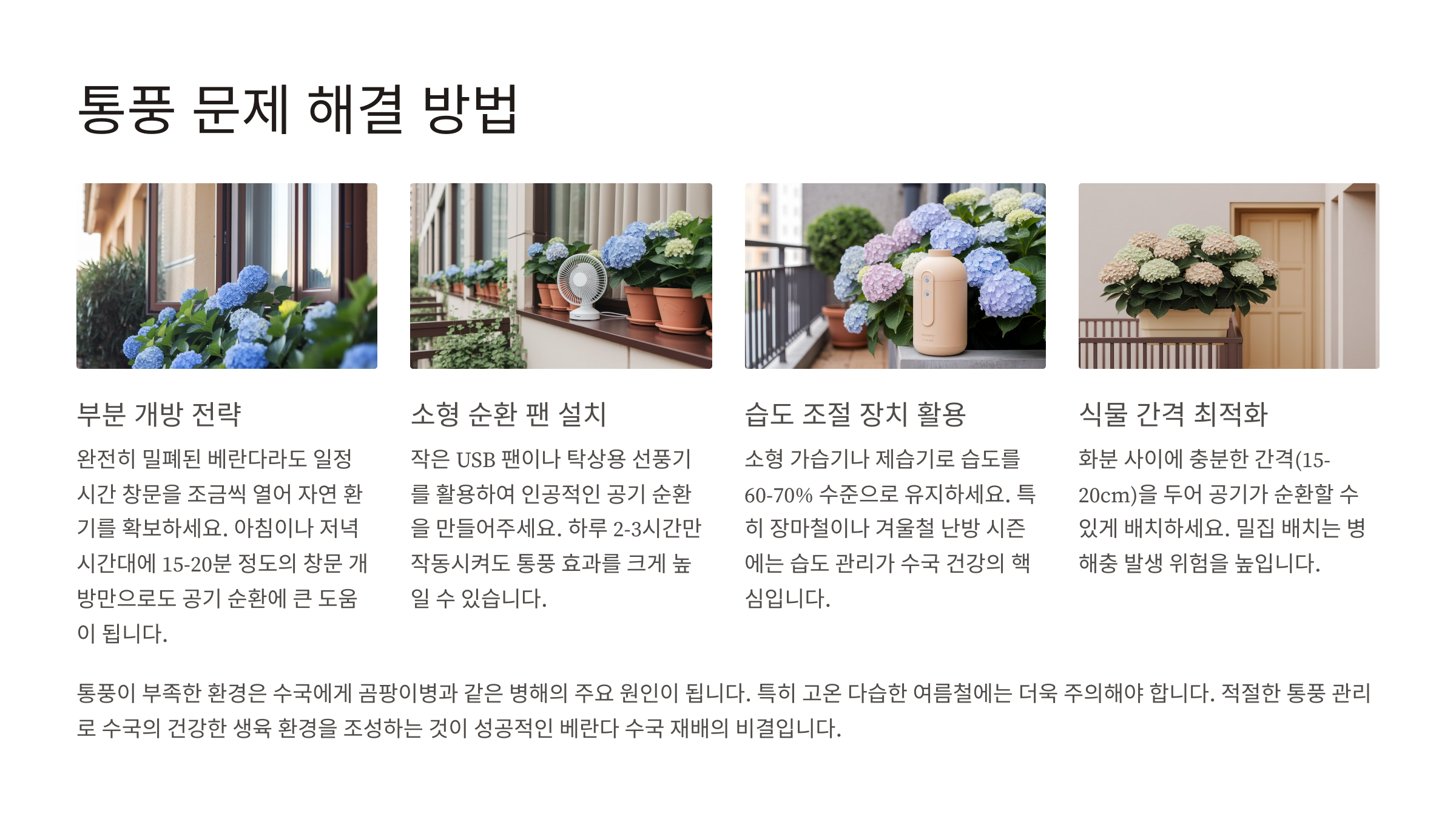 중요한 건 ‘방향, 빛, 통풍, 습도’ 네 가지 포인트예요. 여기에 자동 물주기나 커튼 같은 스마트한 아이템까지 활용하면, 베란다에서도 수국의 대풍이 가능해진답니다!