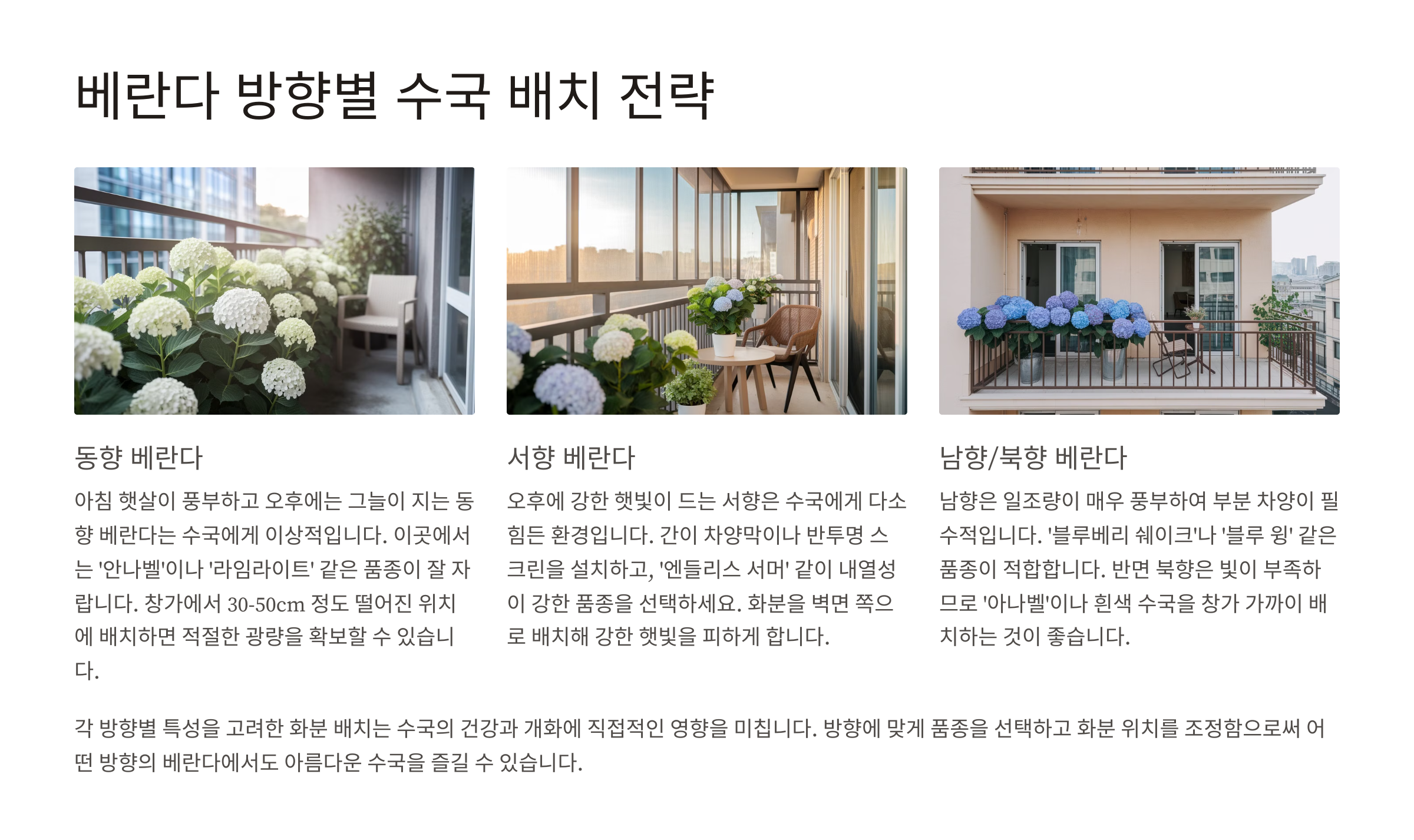 이번 글에서는 방향별 수국 배치부터 계절 관리, 자동 물주기 활용법까지 베란다 환경에 최적화된 수국 마스터 비법을 전부 정리했어요. 초보도 그대로 따라 하면 성공할 수 있게 구성했으니 함께 해봐요!