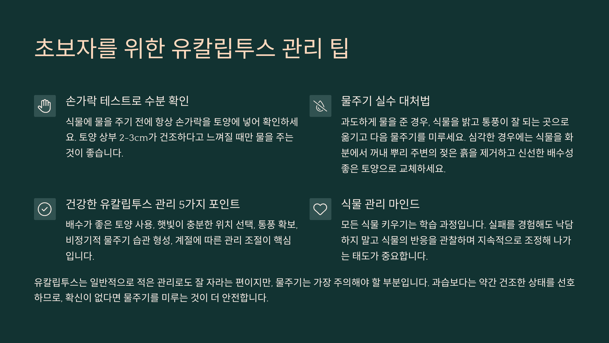 특히 초보자가 자주 저지르는 실수 중 하나가 바로 "너무 자주 주는 물"이에요. 유칼립투스는 과습에 굉장히 약하기 때문에, 흙 상태나 계절을 고려하지 않고 물을 준다면 말라 죽거나 뿌리가 썩기 쉬워요.