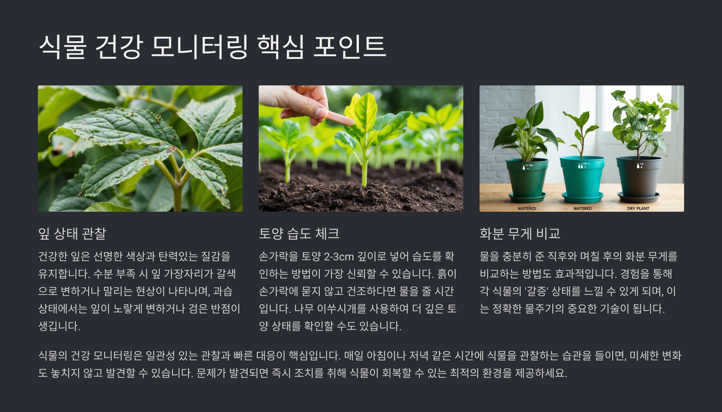| 잎 끝 마름 | 수분 부족 시작 | 즉시 물 보충 |