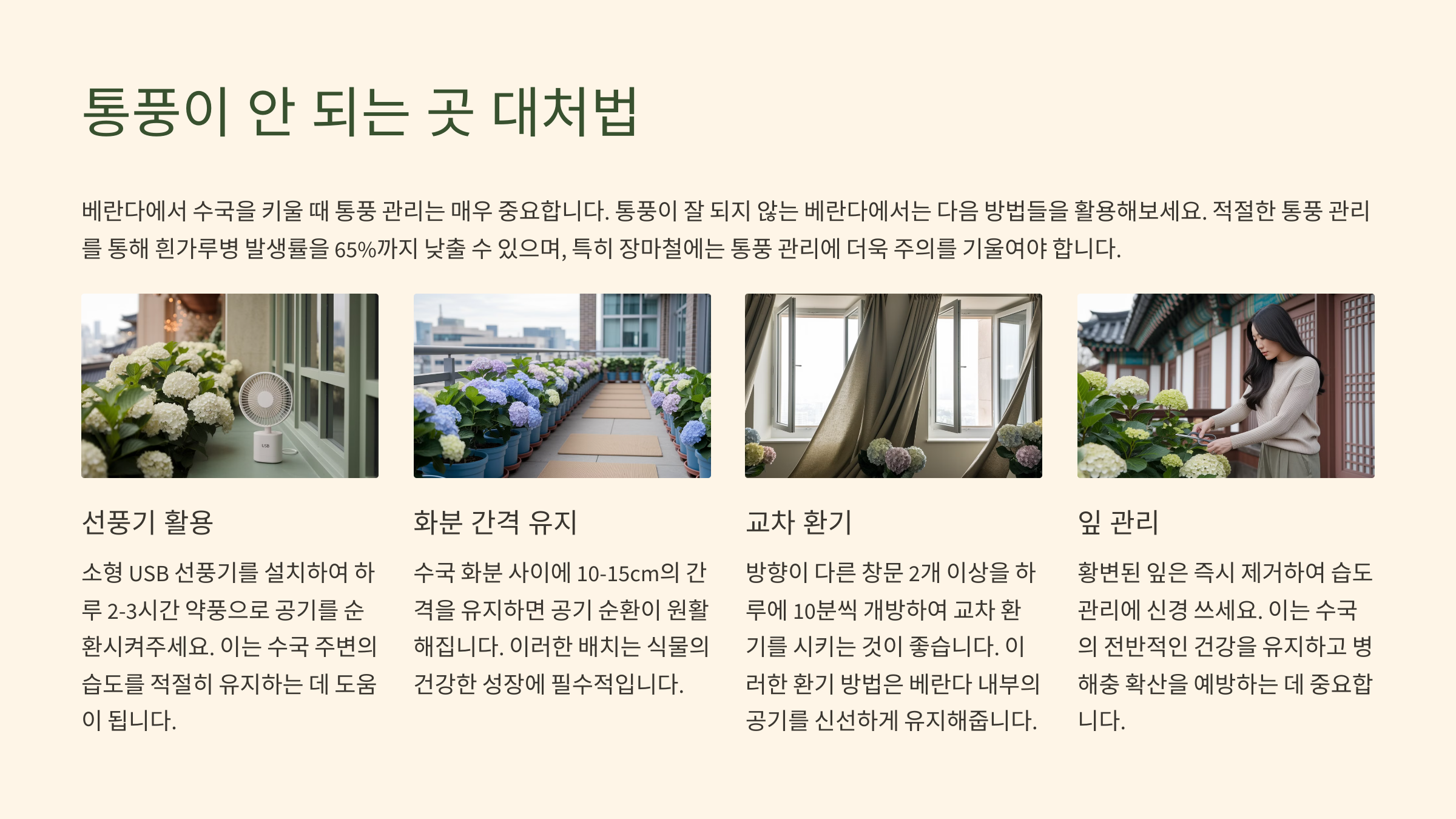 이처럼 베란다 방향만 잘 알아도 수국이 행복해질 수 있어요. 다음은 베란다 통풍이 약한 집에서 수국을 어떻게 관리할 수 있을지 꿀팁을 알려드릴게요! 🌬️