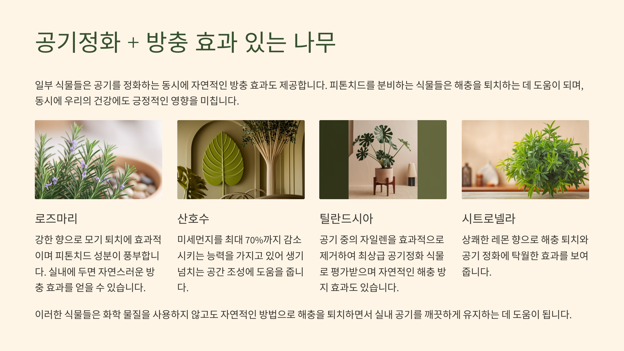 여름철이나 환기 어려운 공간에서는 벌레 걱정도 무시 못 하죠. 이럴 때는 공기를 정화해주면서 동시에 해충을 멀리하는 식물을 선택하는 게 좋아요 🌿
