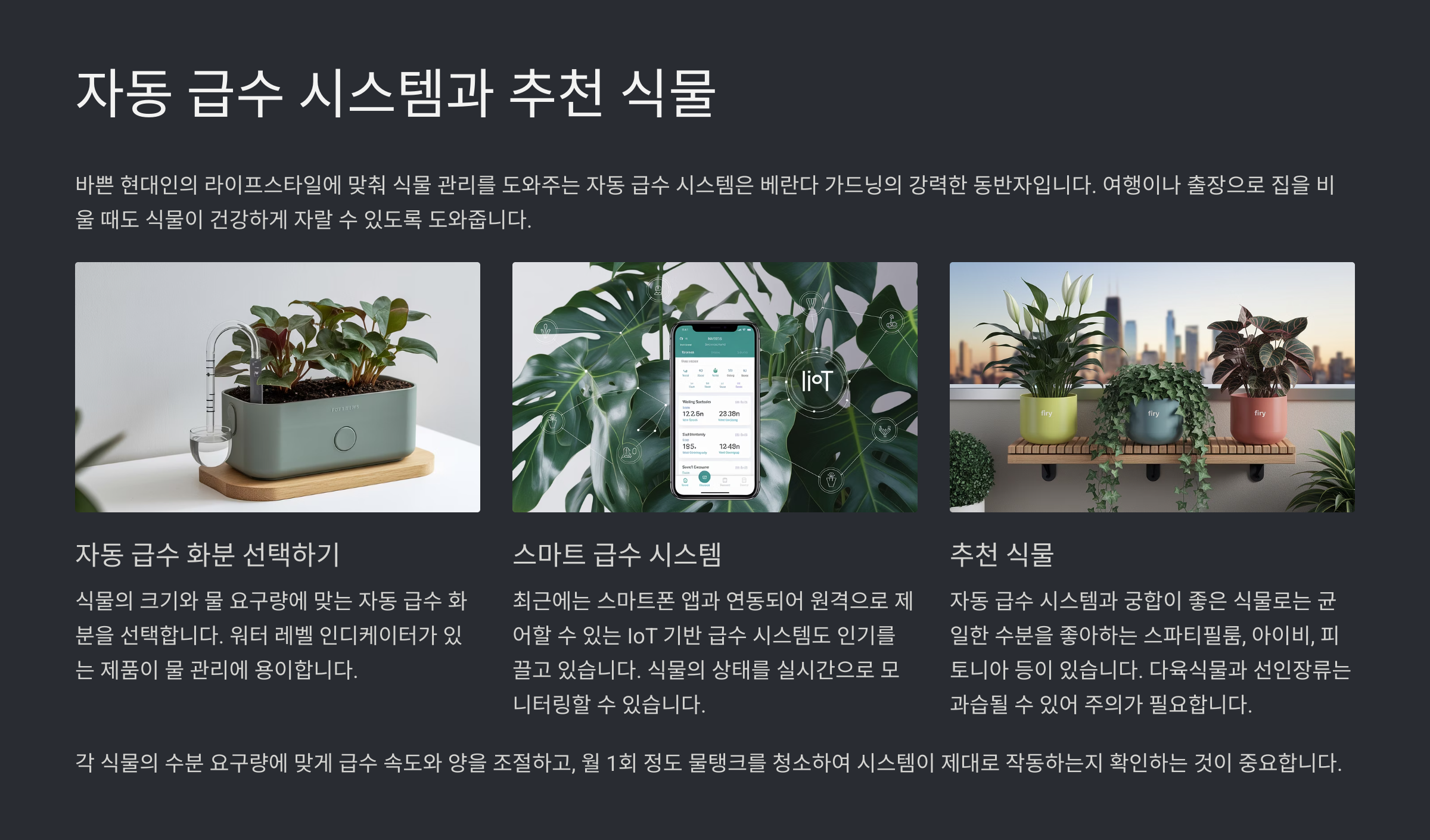 대표적인 식물은 스투키, 산세베리아, 필로덴드론이에요. 이 식물들은 물을 자주 주지 않아도 돼서 자동 급수 장치와 찰떡이에요.