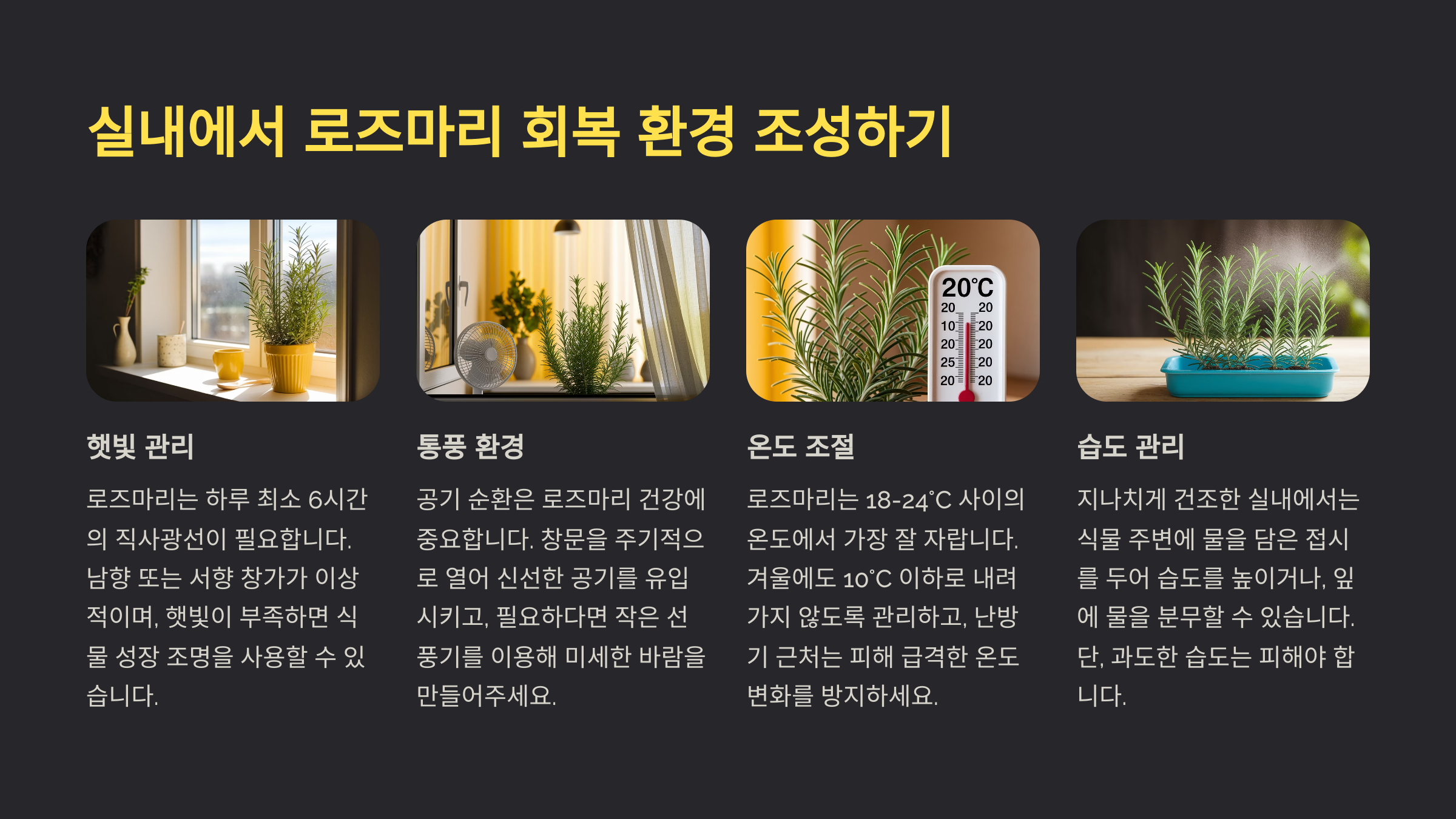 물 관리와 더불어 회복에는 실내 환경 세팅도 아주 중요해요. 특히 온도, 빛, 공기 흐름 이 세 가지 요소가 적절하게 갖춰져야 해요. 🌬☀️