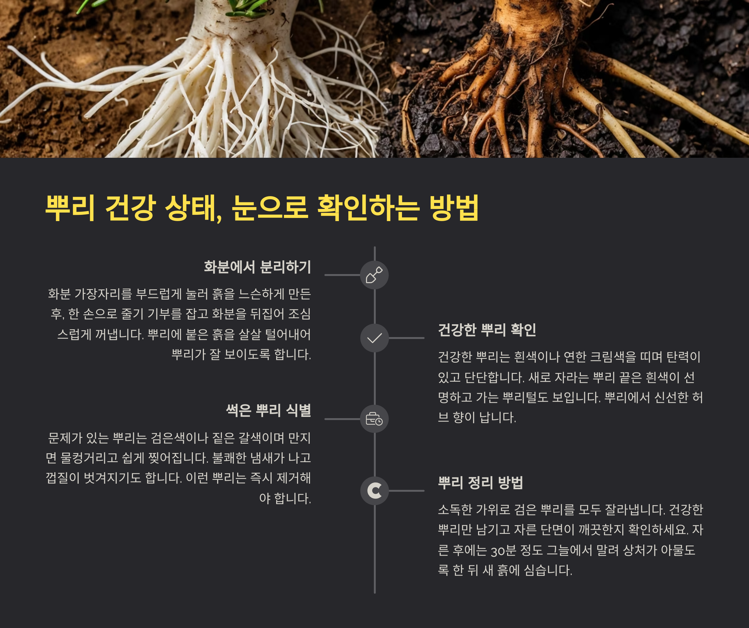 식물을 조심스럽게 뽑아보면 뿌리 상태를 확인할 수 있어요. 흰색 또는 연한 갈색이고 단단하다면 건강한 상태예요. 반대로 검고 물컹하거나 냄새가 나면 이미 썩은 거예요.