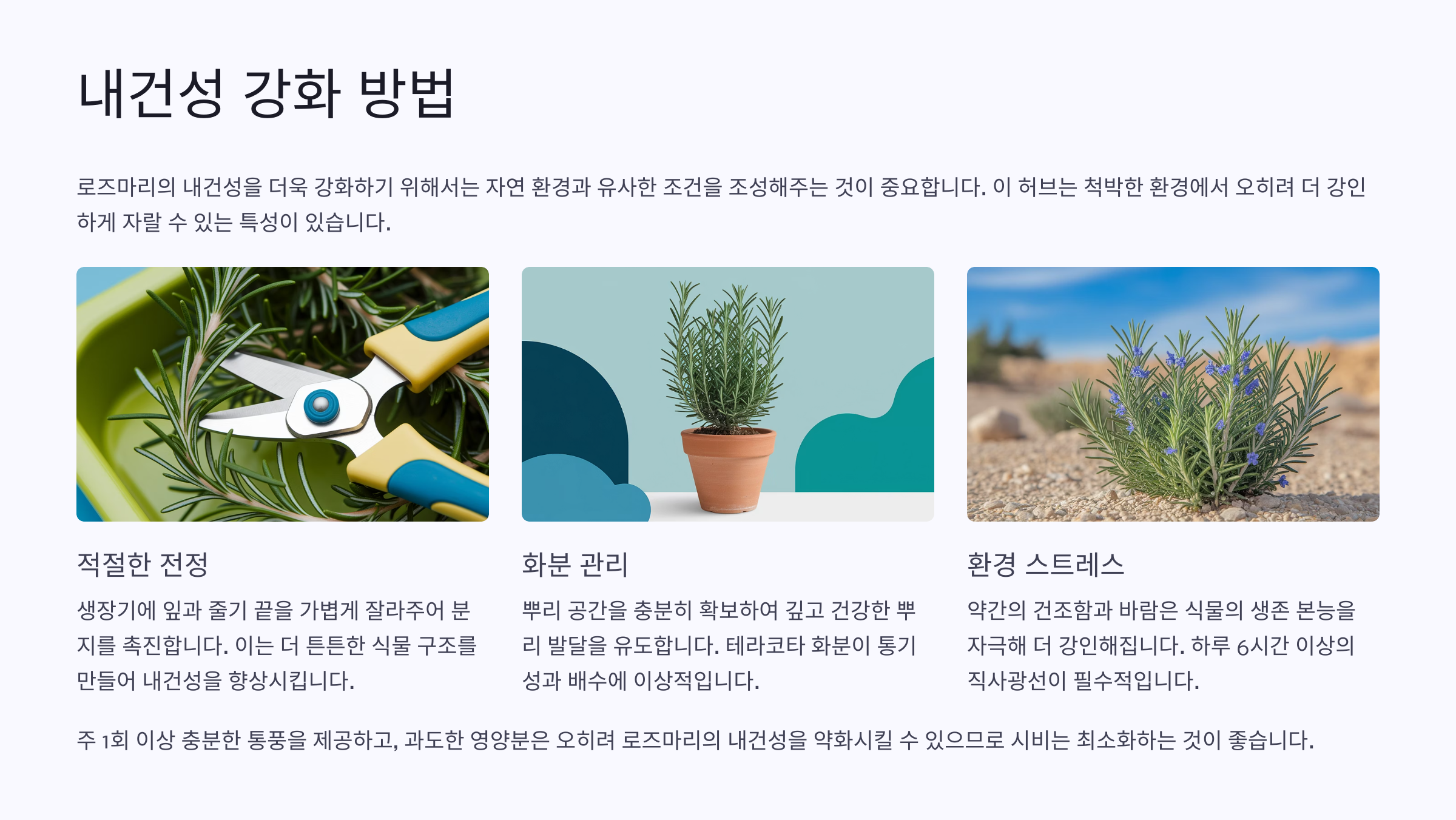 로즈마리를 정말 튼튼하게 키우고 싶다면 내건성을 더 강화해줘야 해요. 내건성이란 '건조한 환경에서도 잘 버티는 힘'을 뜻하는데요, 이건 관리에 따라 충분히 높일 수 있답니다.