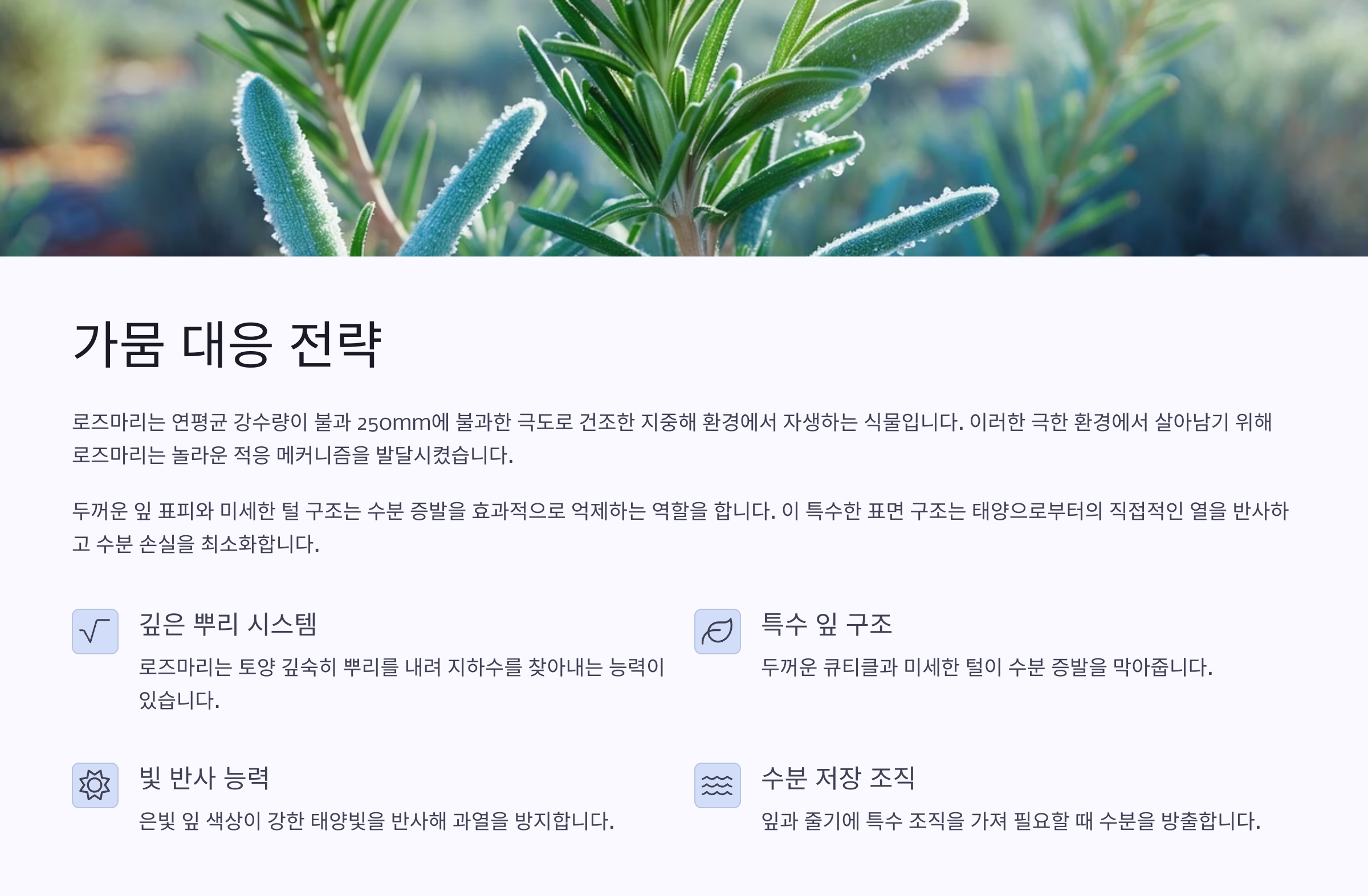 로즈마리는 극한의 가뭄도 이겨낼 수 있는 놀라운 생존 전략을 갖고 있어요. 실제로 자연 상태에서 로즈마리는 몇 주 동안 비가 오지 않아도 생존이 가능해요. 이 비결은 바로 뿌리 구조와 잎의 생리적 특징에 있어요.