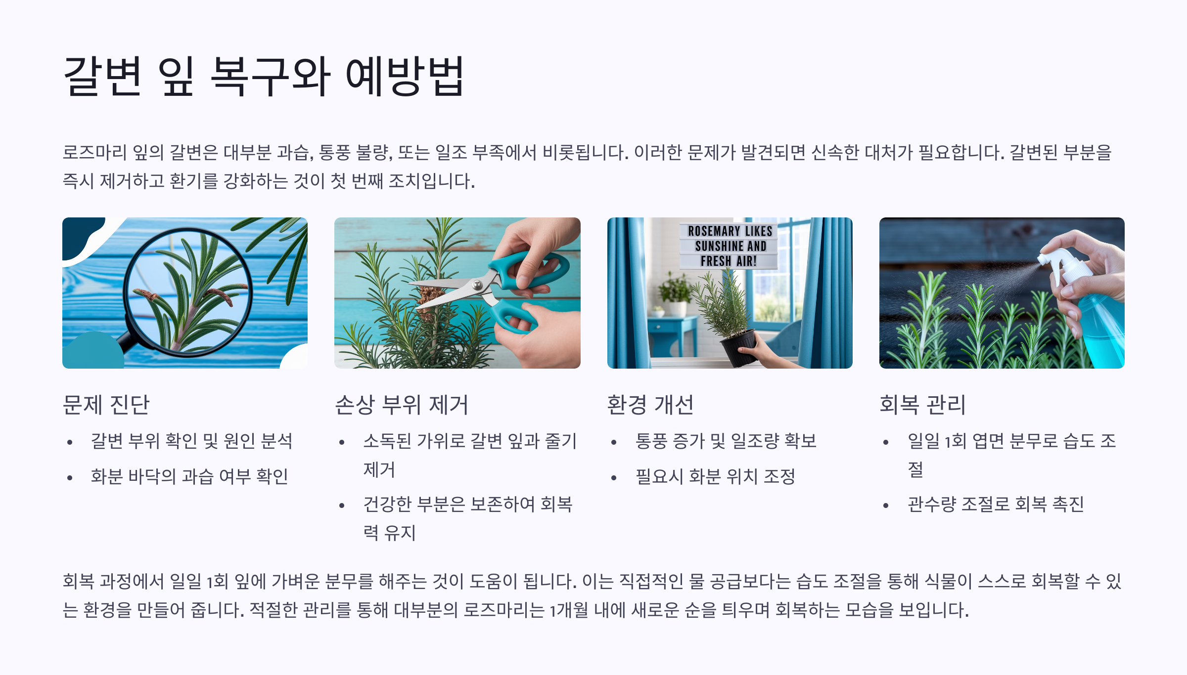가끔 로즈마리 잎이 갈색으로 변하고 마르듯 떨어질 때가 있어요. 이건 물 부족 때문일 수도 있고, 과습이나 통풍 부족, 해충 때문일 수도 있어요. 원인을 정확히 파악해서 복구에 들어가야 해요.