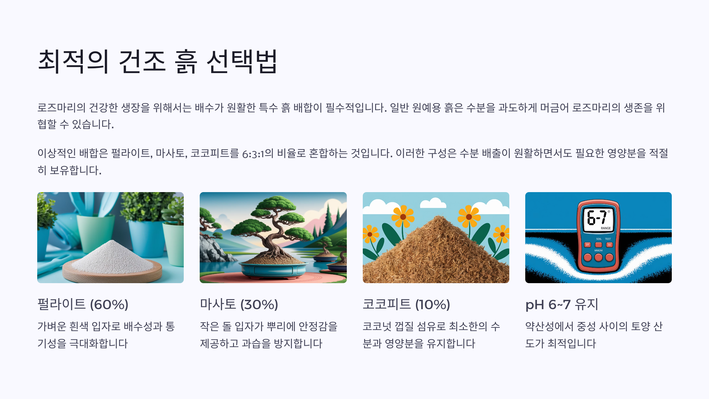 로즈마리를 건강하게 키우려면 흙이 정말 중요해요. 습기 많은 흙은 절대 금물이고, 배수성이 좋은 흙을 선택해야 해요. 이상적인 흙은 마사토, 펄라이트, 피트모스를 섞은 혼합토예요.