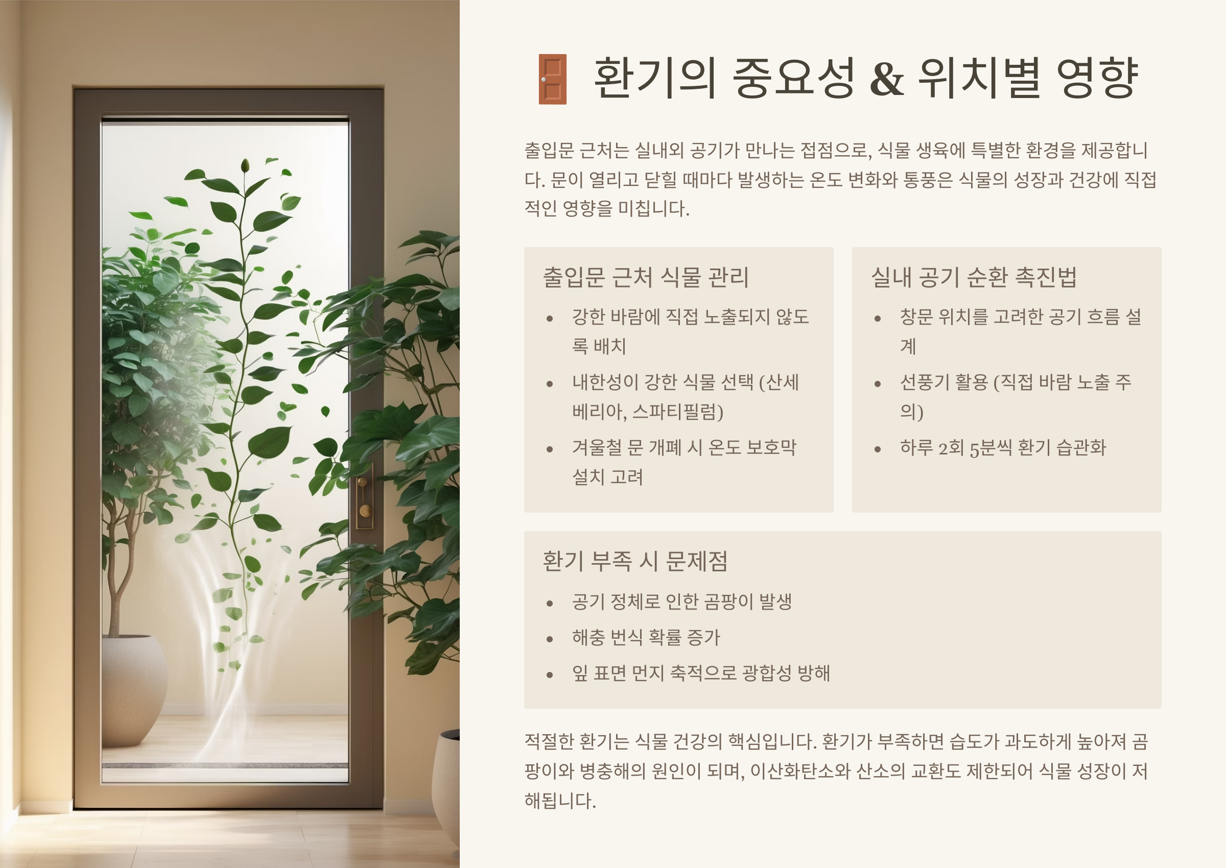 환기 좋은 자리는 곰팡이와 병해를 줄여주는 장점도 있지만, 건조 속도가 빨라지기 때문에 평소보다 더 세심한 관리가 필요하답니다. 문 열고 닫는 횟수가 많은 위치일수록 변화를 민감하게 체크해주세요!