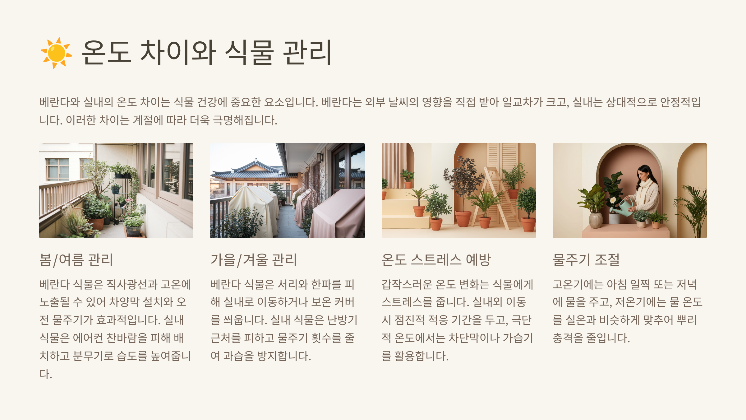 | 야외 노출 | 반그늘에 배치 | 햇빛 과열 방지 |