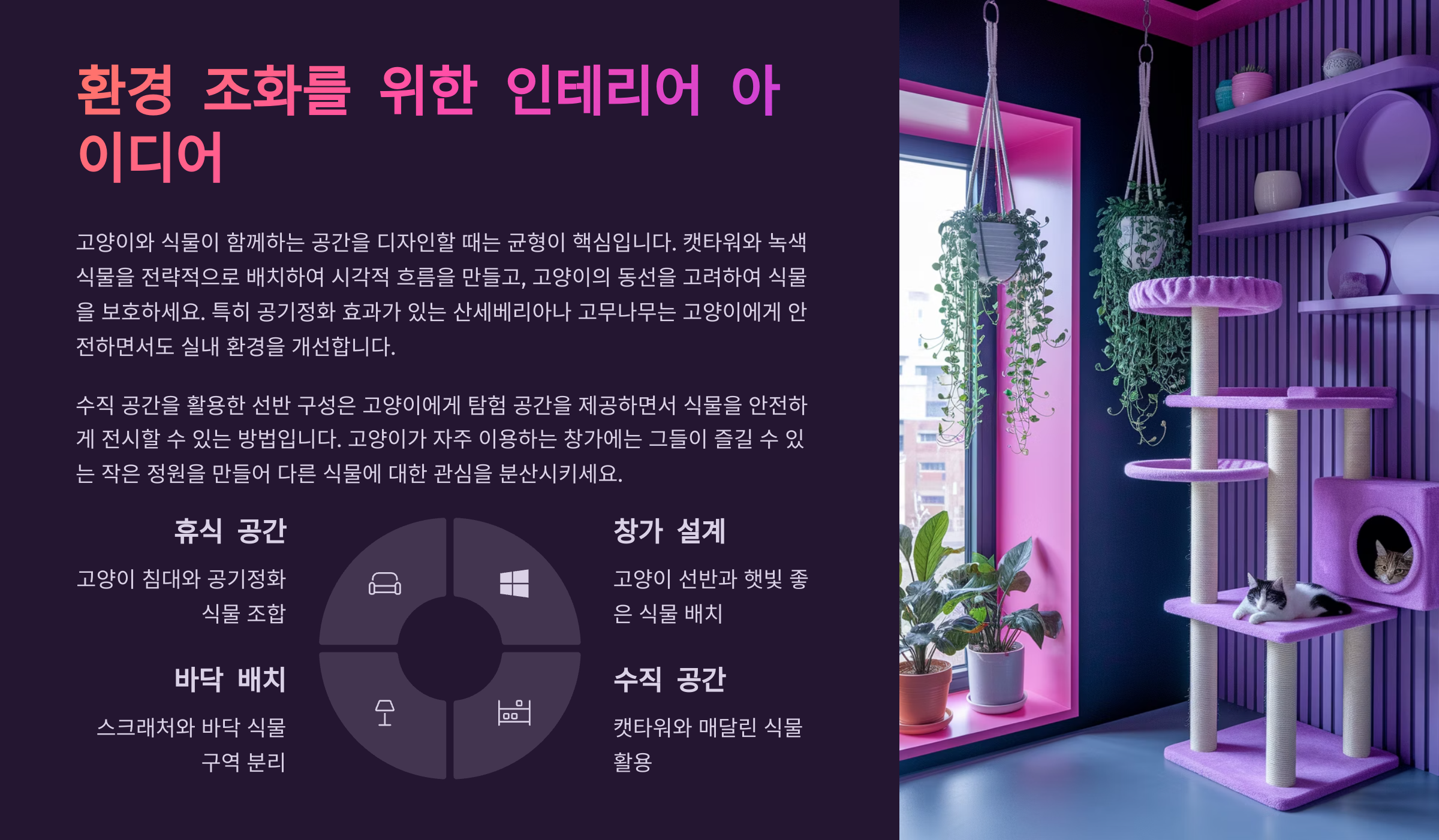 두 번째는 **식물과 고양이 공간을 시각적으로 분리하는 디자인**이에요. 식물은 밝고 생기 있는 공간에, 고양이 공간은 아늑하고 포근한 공간에 배치하면 기능적 분리가 자연스럽게 이루어져요. 러그나 바닥 컬러를 다르게 사용해도 효과적이에요.