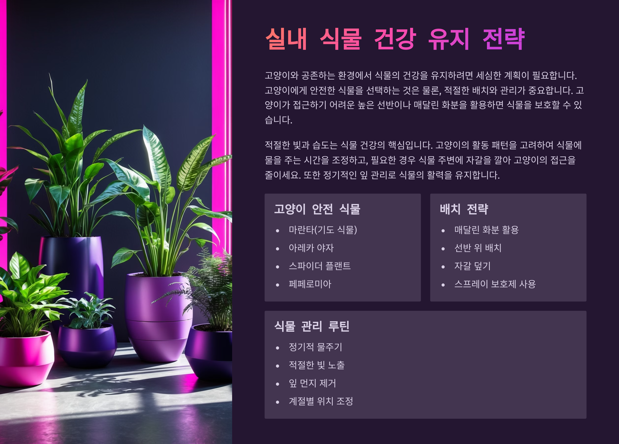 | 동선 분리 | 식물은 고양이 동선 밖에 배치 | 충돌 예방 |