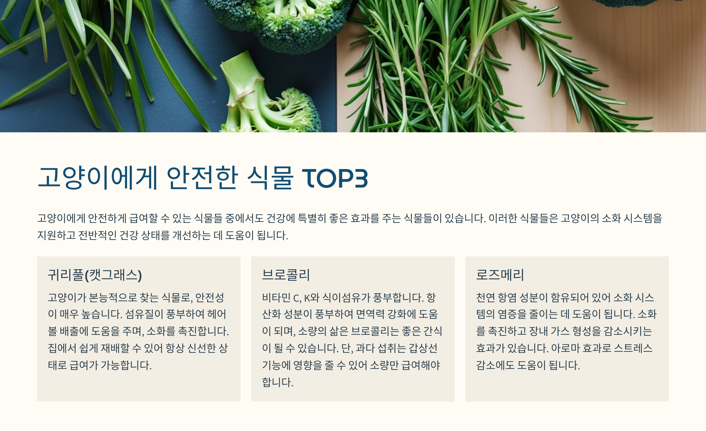 이처럼 고양이에게 도움이 되는 식물은 생각보다 다양해요. 단, 모든 식물이 고양이에게 안전한 건 아니기 때문에 반드시 급여 전에는 독성 여부를 확인하는 게 기본이에요.