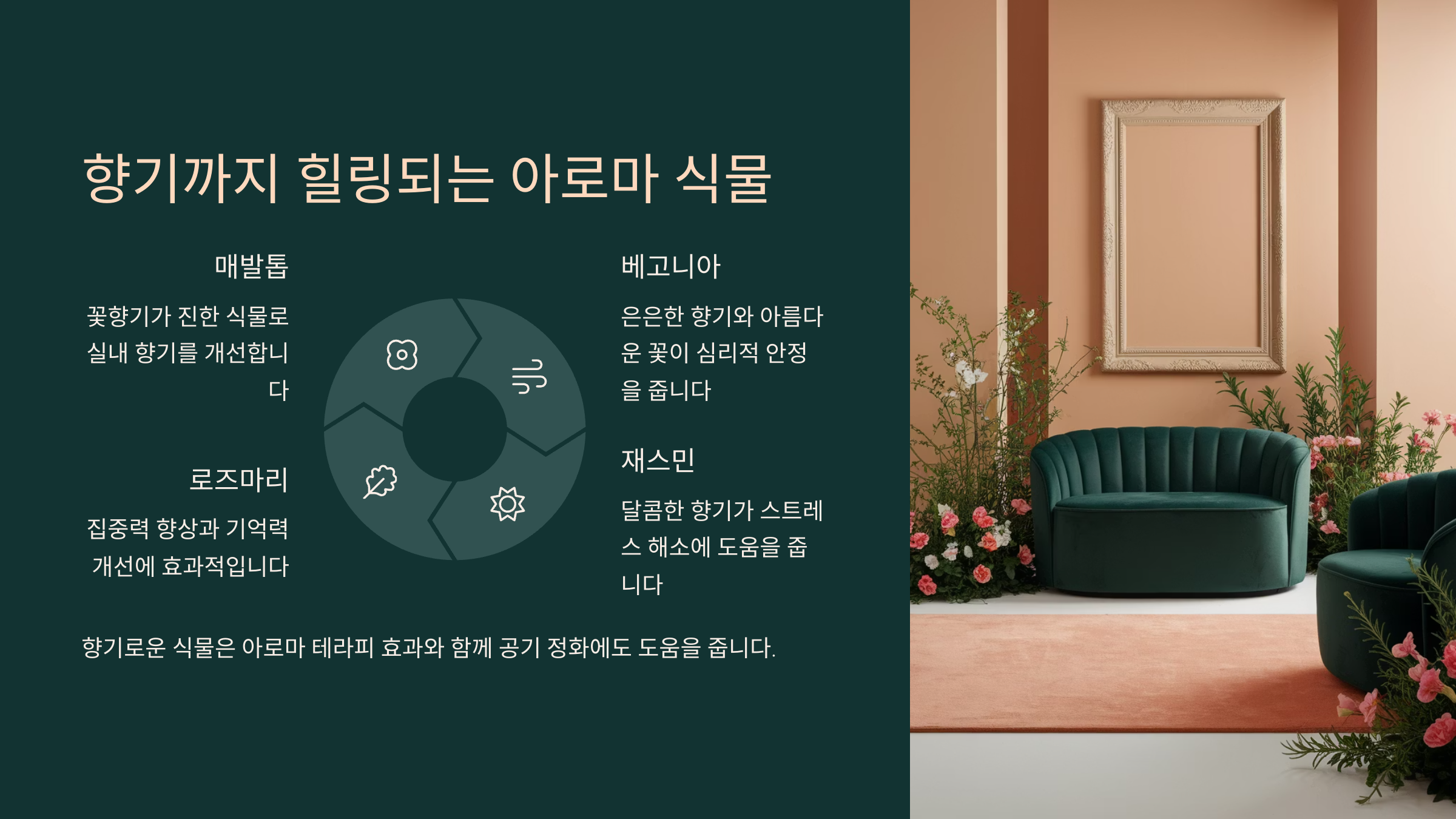 이처럼 각 공간에 맞는 식물을 선택하면 단순한 장식 이상의 효과를 누릴 수 있어요. 집안 전체가 천연 힐링 공간이 되는 거죠! 🌿 다음은 향기까지 힐링되는 아로마 식물에 대해 소개할게요. 향기로 마음을 편안하게 만들어봐요 💐